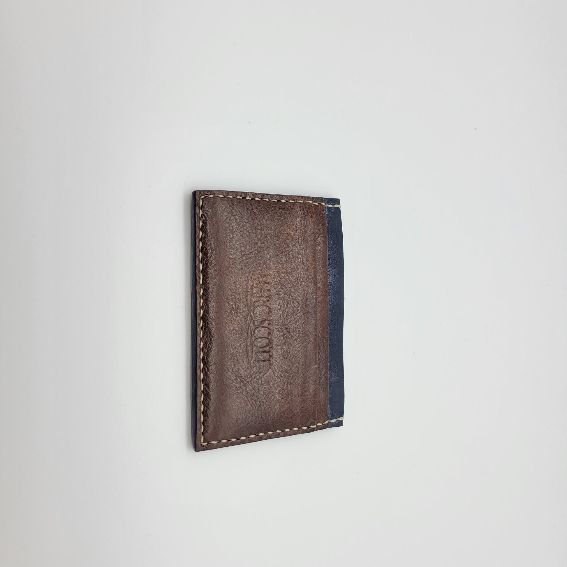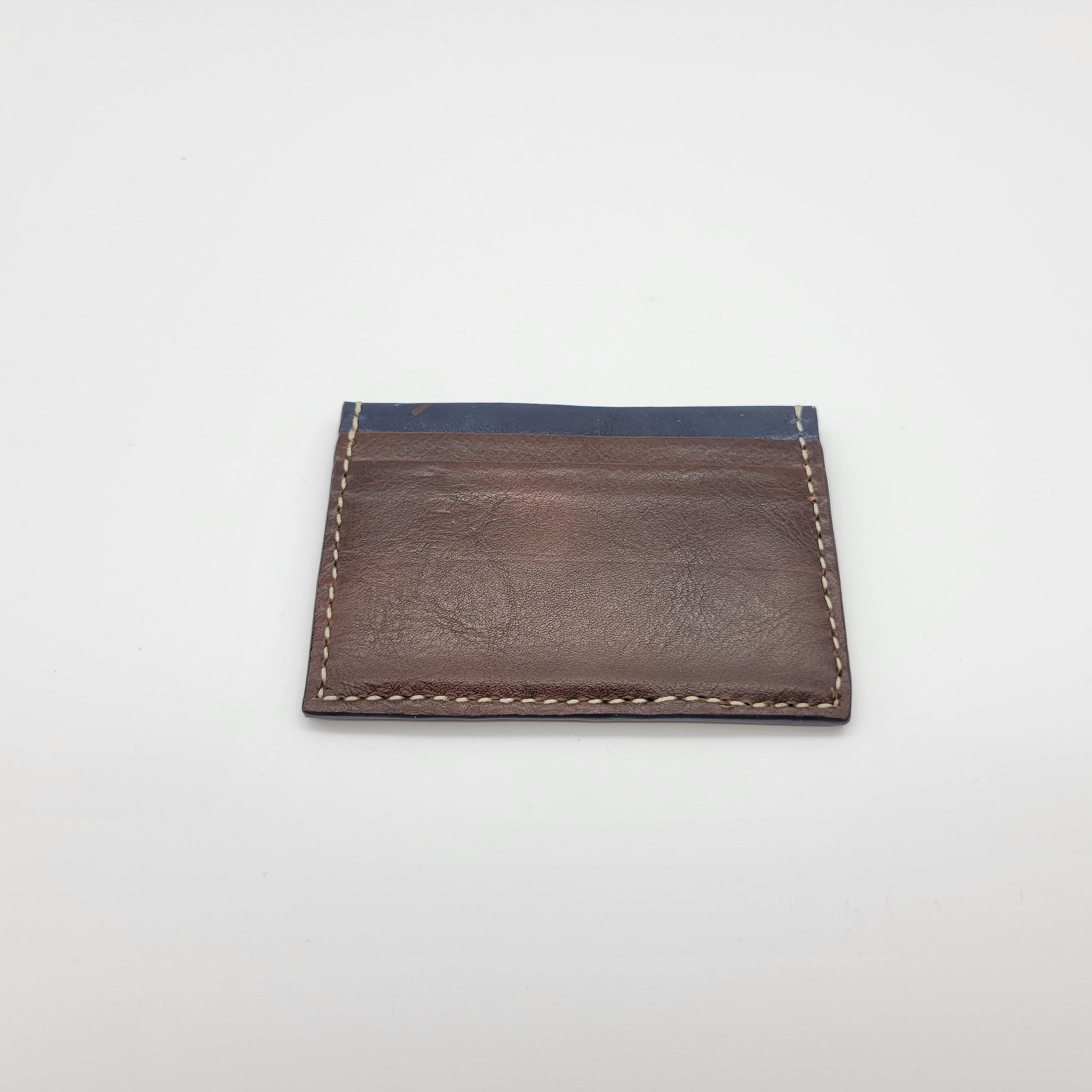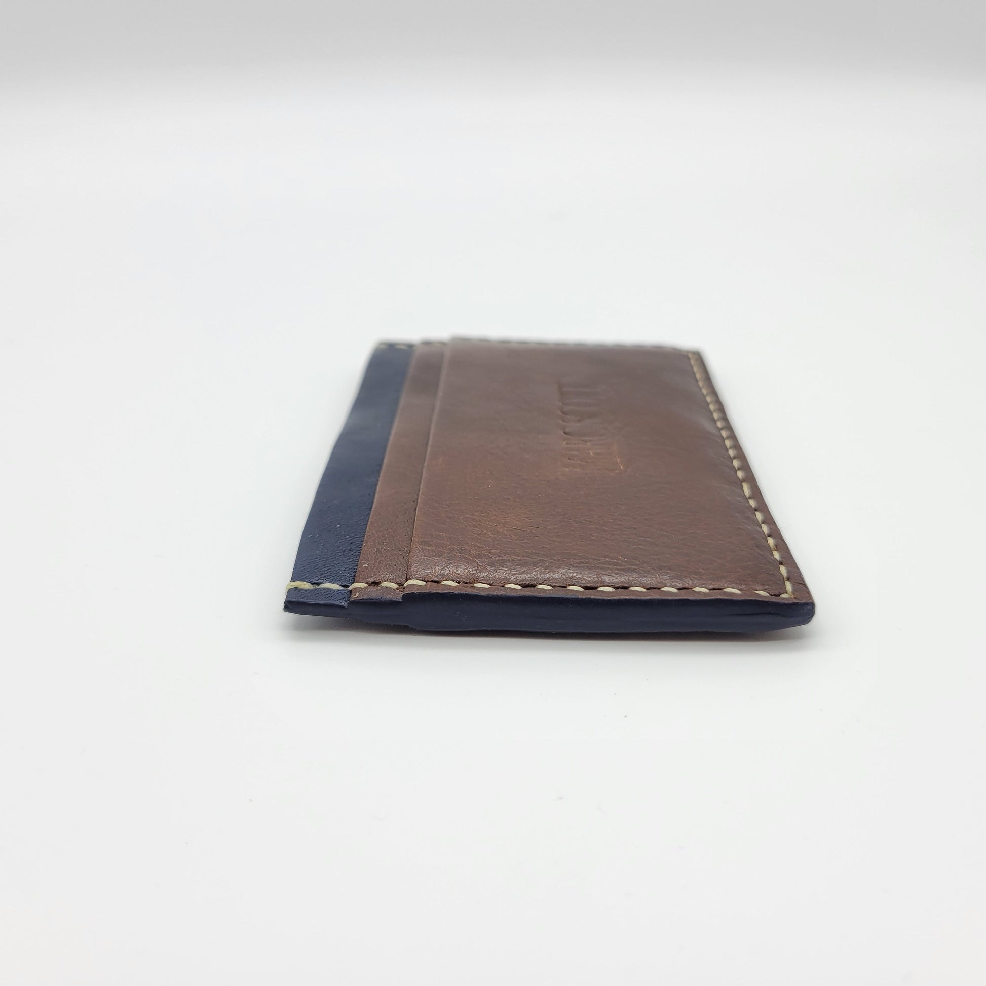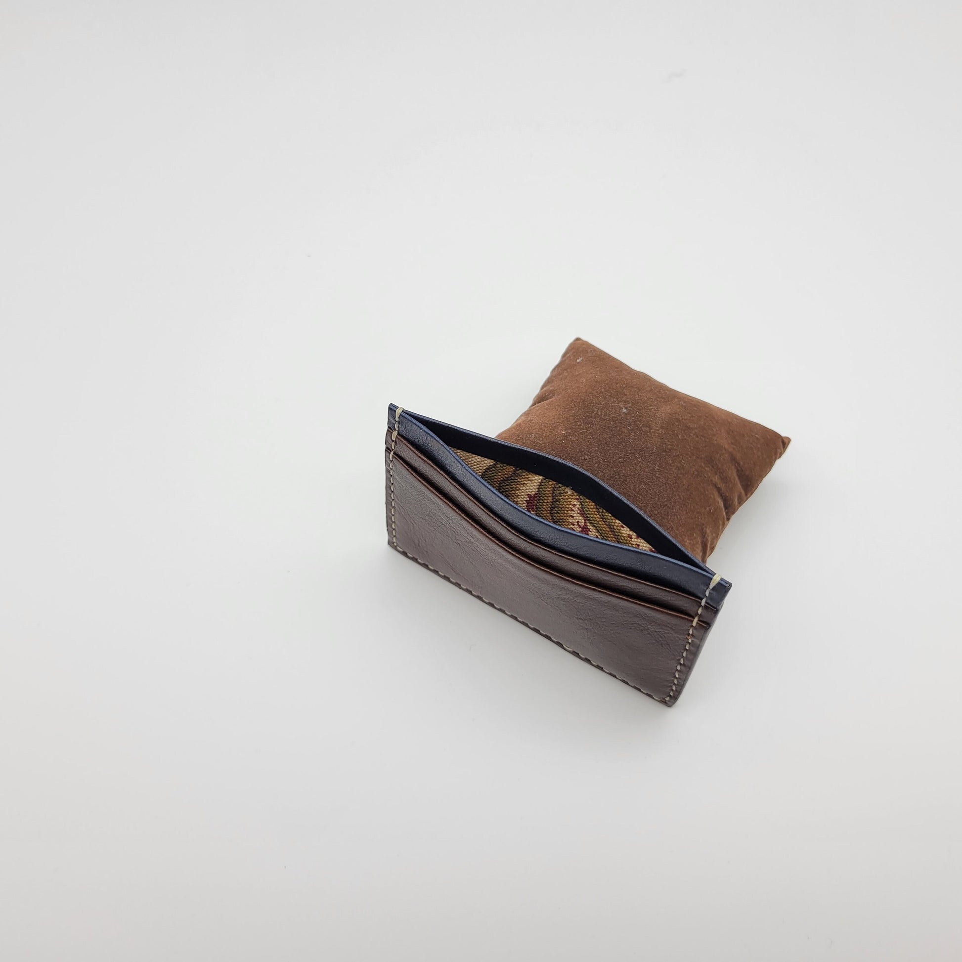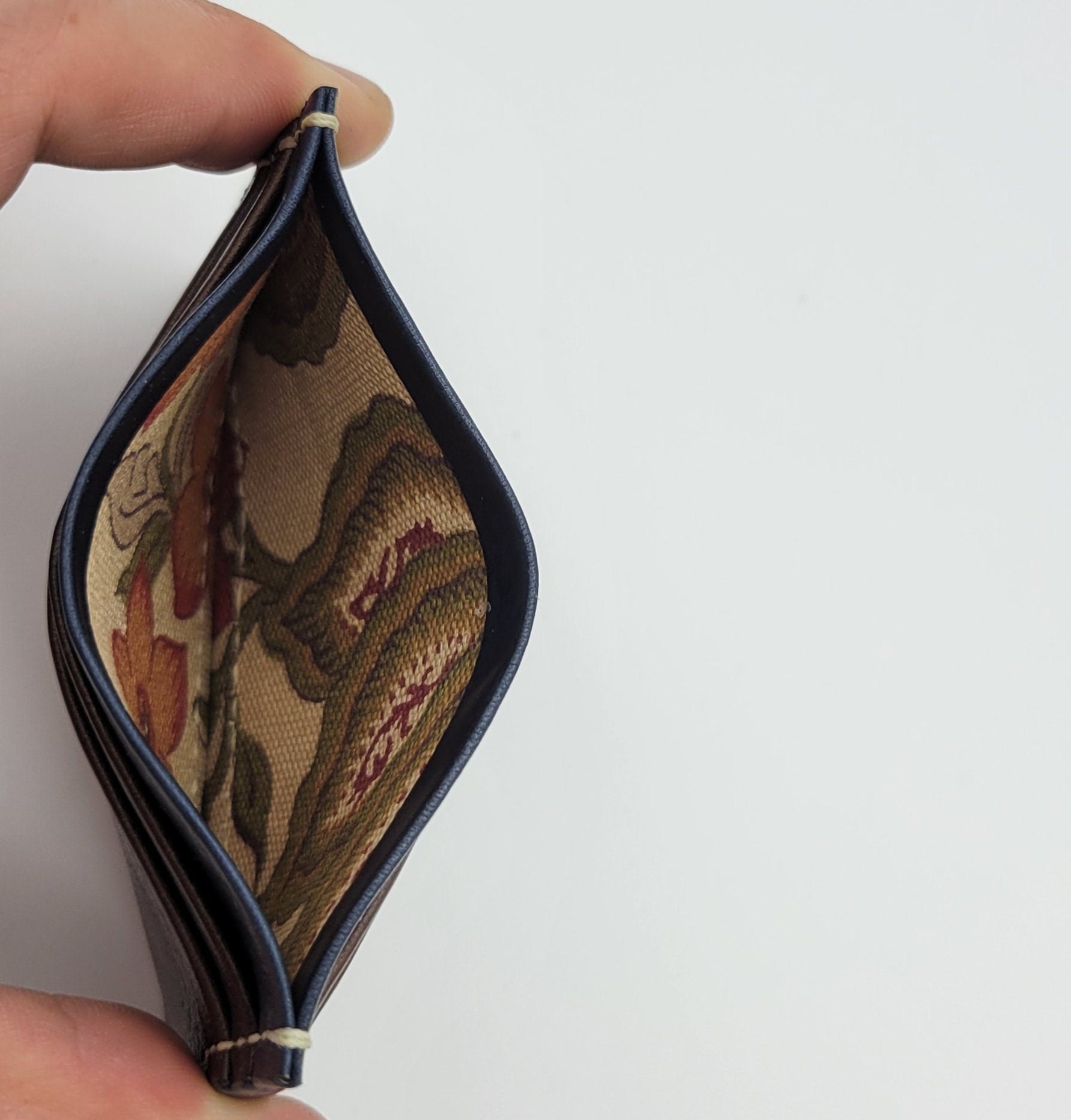 Alia is a 5 card slot wallet. This is lined with a patterened cotton canvas, and blue and brown leather. This includes blue painted edges