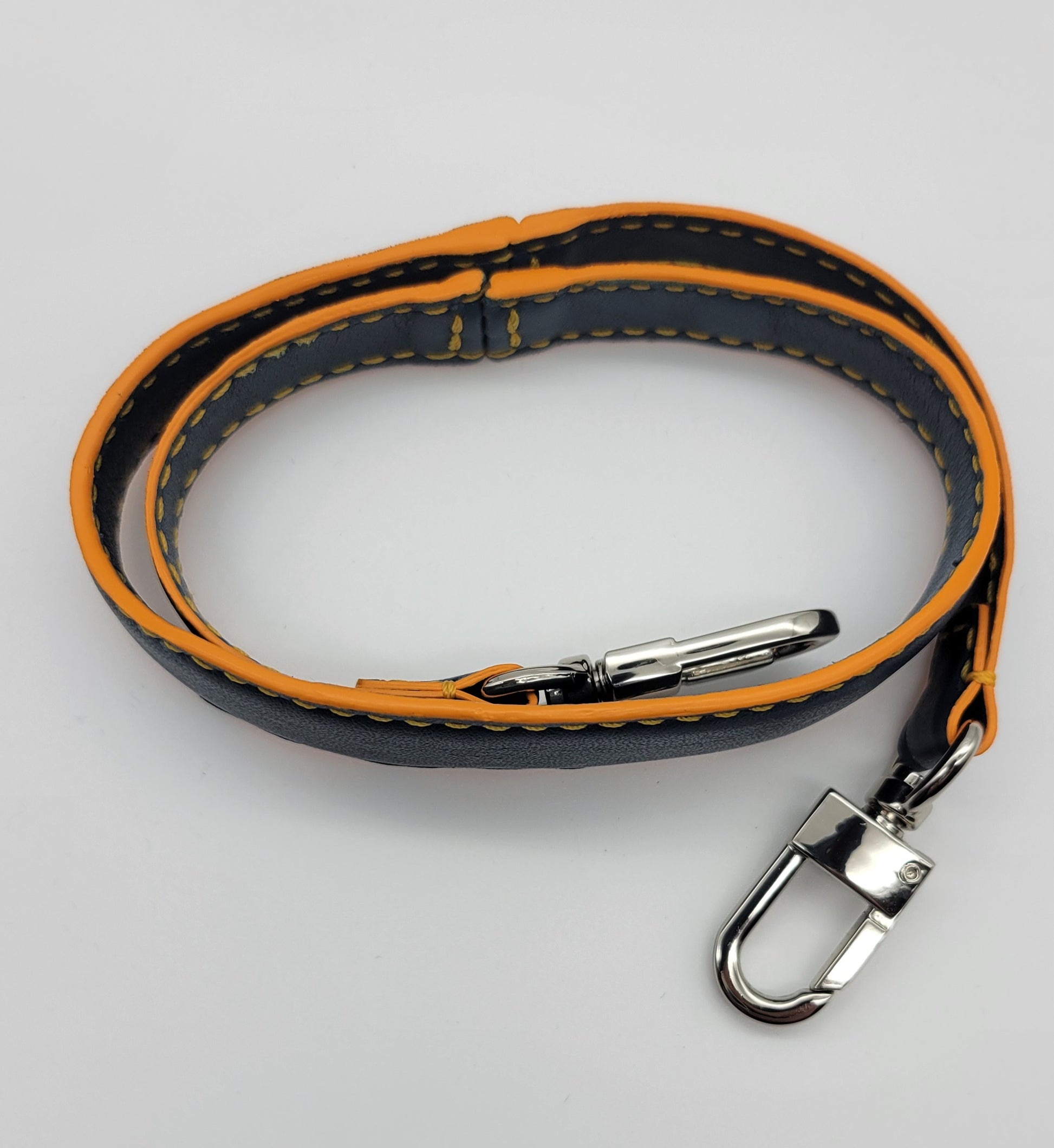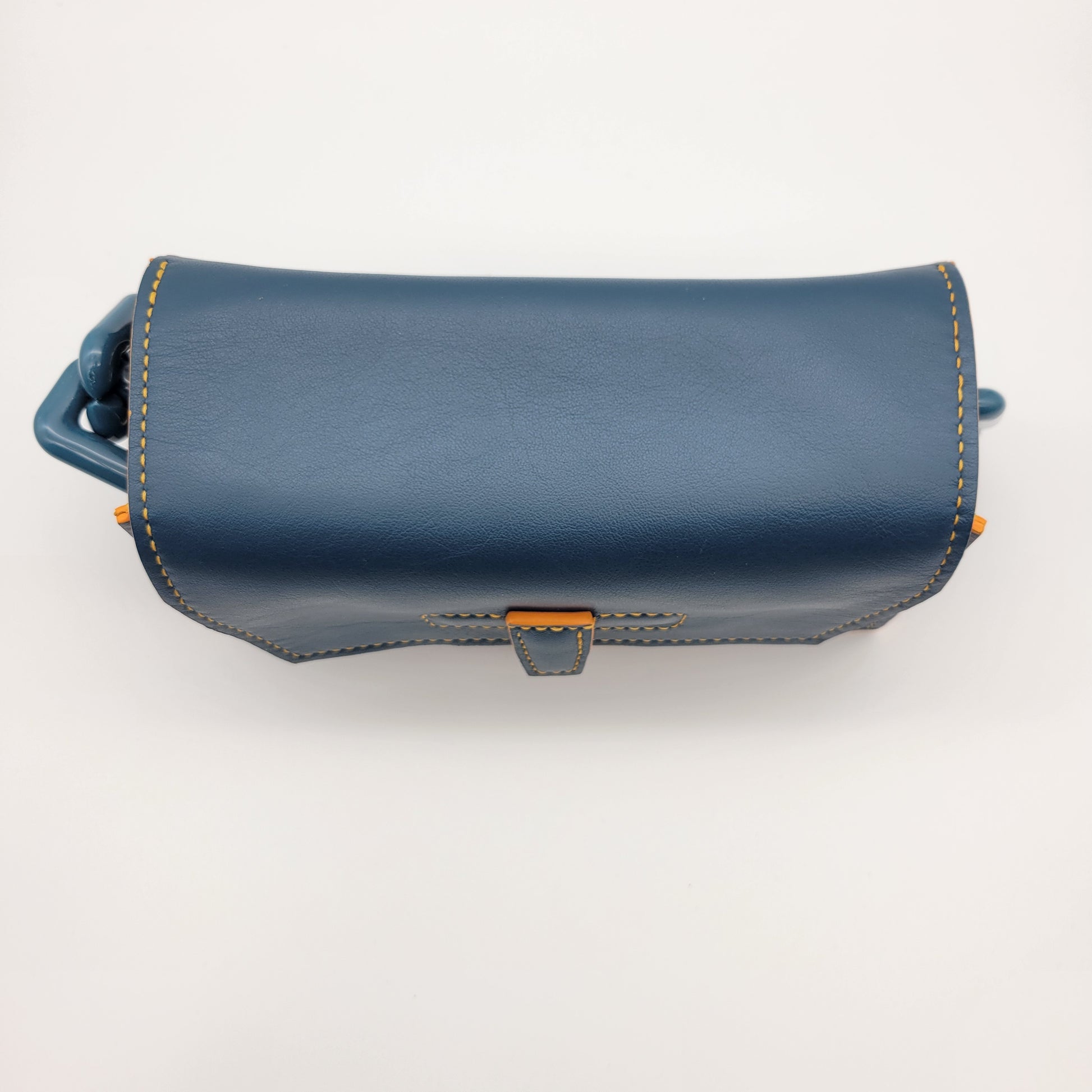 The Amira is perfect for any special event. This bag features a soft top grain blue leather. The interior is an exotic colorful sun orange leather including a back pocket which is lined with the same leather. This bag features silver hardware. The handle is adjustable strap that can be worn on the arm or on the should. The edges are painted with a sun orange edge pain that matches the interior leather. There is one outside pocket with a magnet closure on the front. With this bag being hand stitched, it will withstand the test of time. Our focus on craftsmanship shines with the Marley. All our products are 100% handmade. We cut, sew and paint by hand.