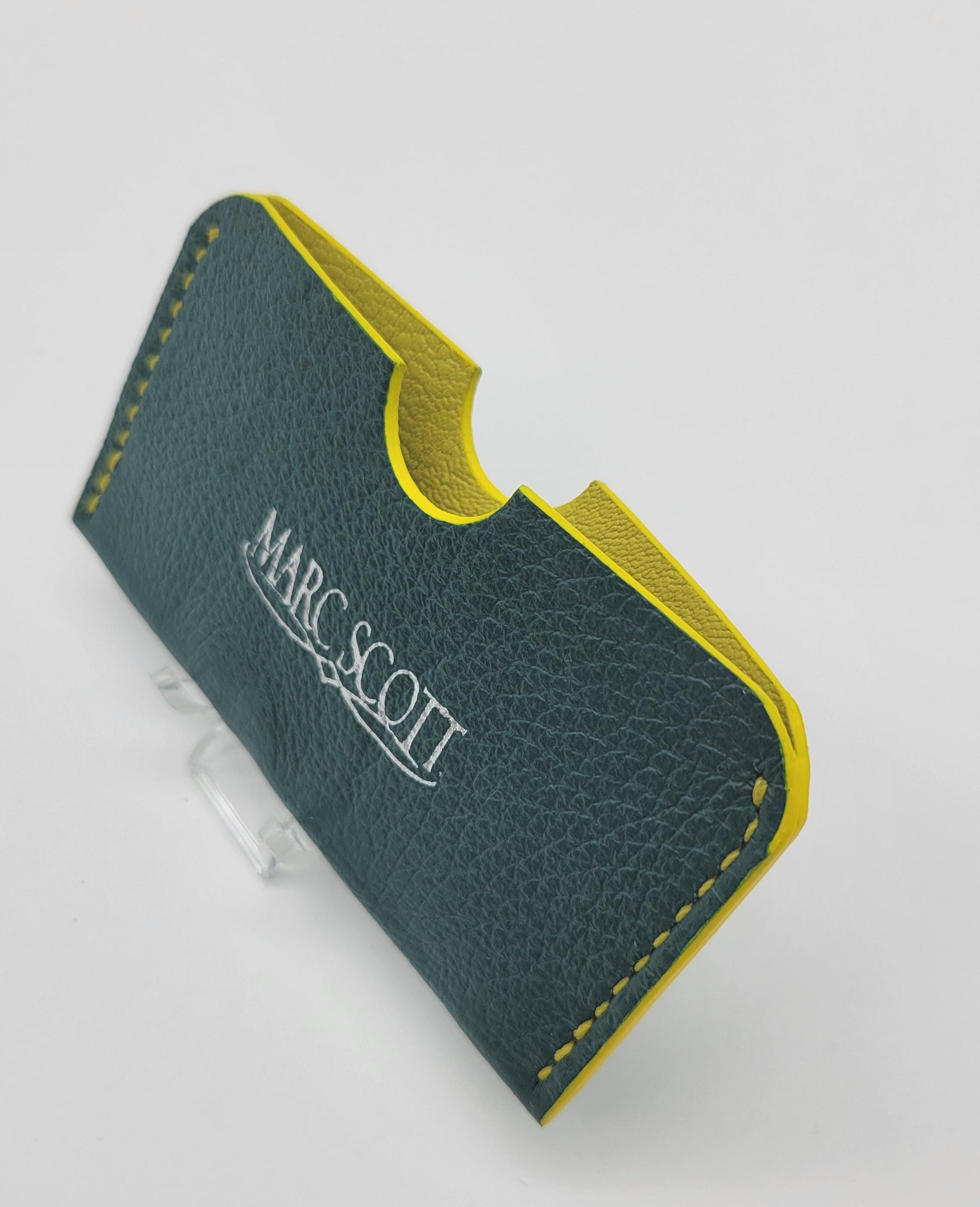 This single slot card wallet is full leather exterior and interior. We have matching edge paint to the leather lining. These wallets can hold 2-3 cards. All our products are hand sewn to provide high-quality goods. Dimensions: Length: 4" High: 2"