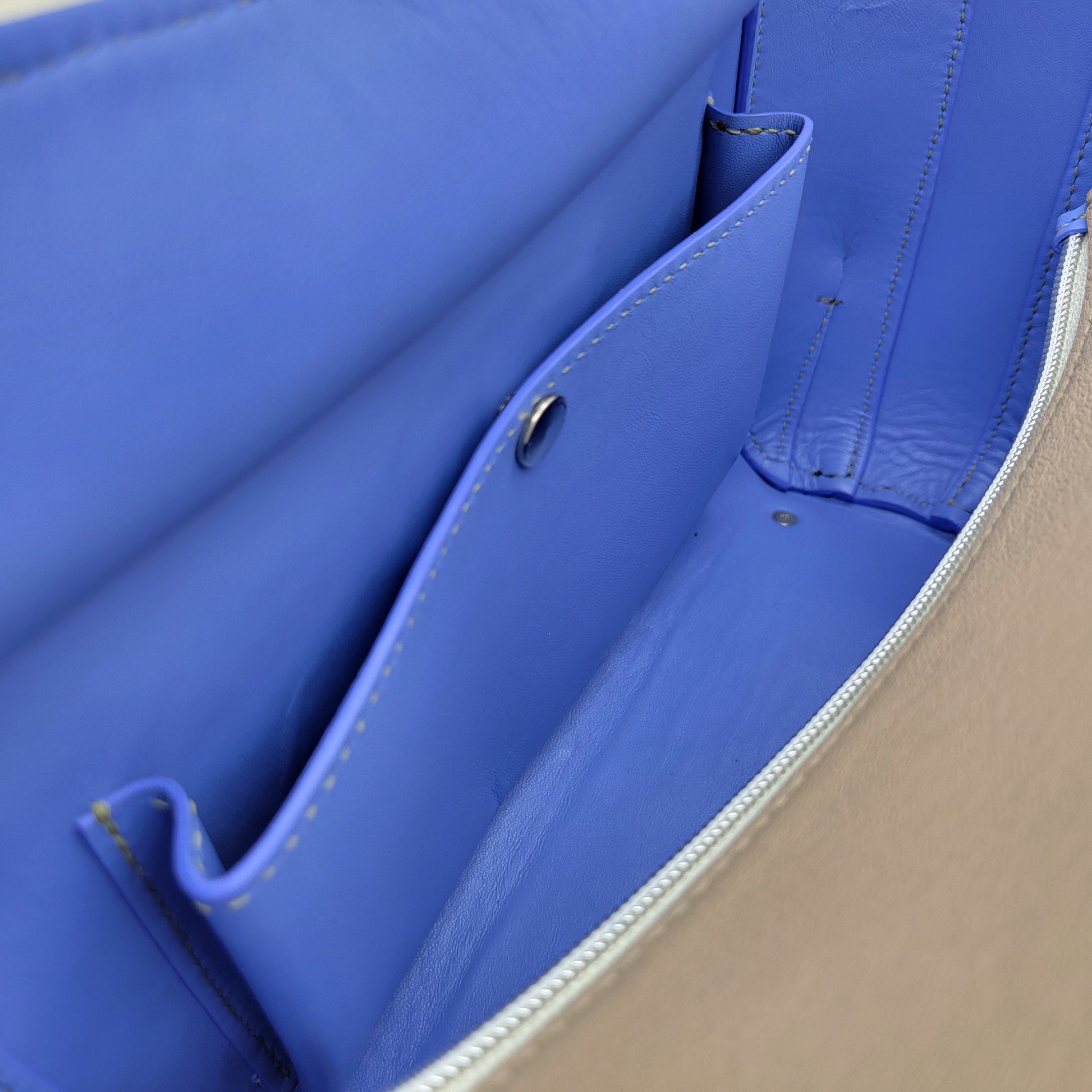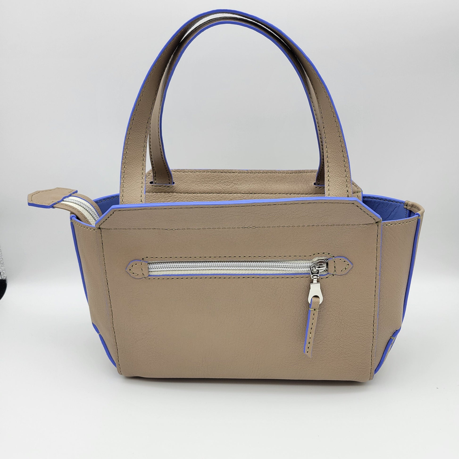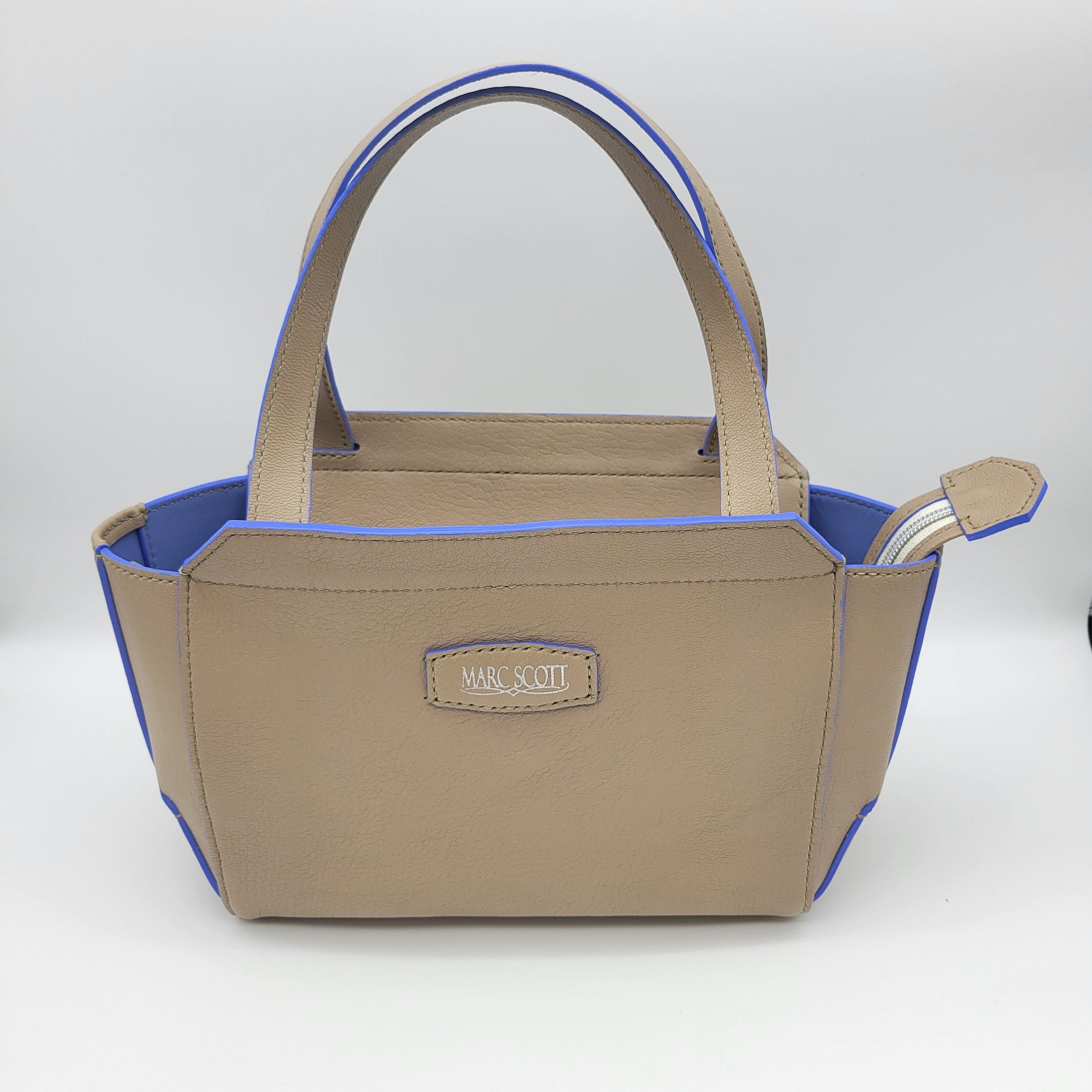 The Ellie is a functional and stylish leather handbag including the Marc Scott badge. This bag is made in Seattle, WA. We use artisan techniques such as hand stitching to ensure the bags are built to withstand a lifetime. This bag is a goat skin exterior that has a durable finish while still showing off the natural grain. The interior is a periwinkle soft goat skin. The top zipper opens up for full access to the interior of the bag which includes a button pocket and 2 card slot. The bag includes an exterior zipper pocket and four feet to help reduce the wear of the leather. L: 12" W: 4.5" H: 7"