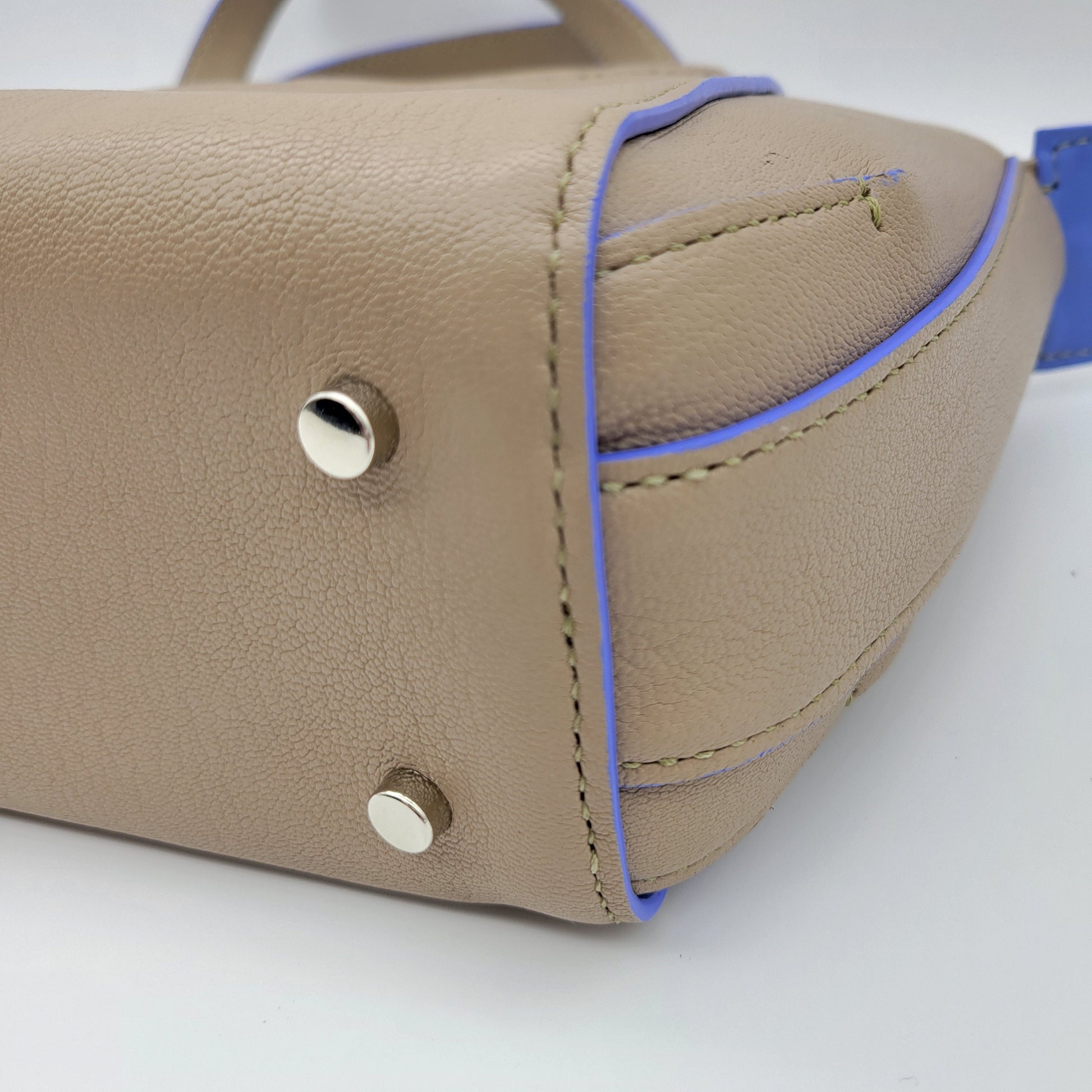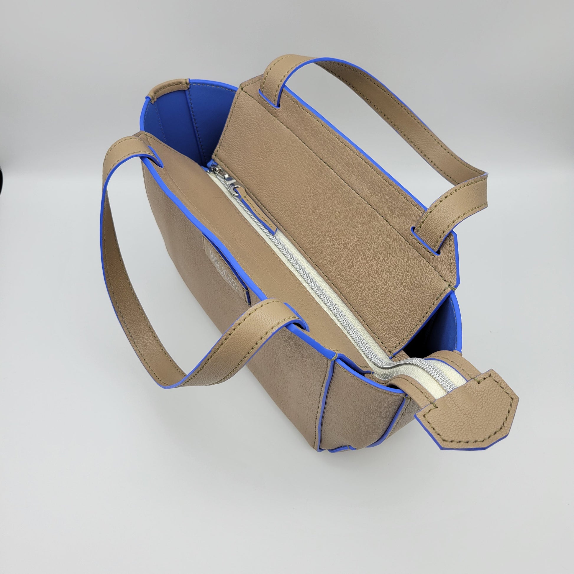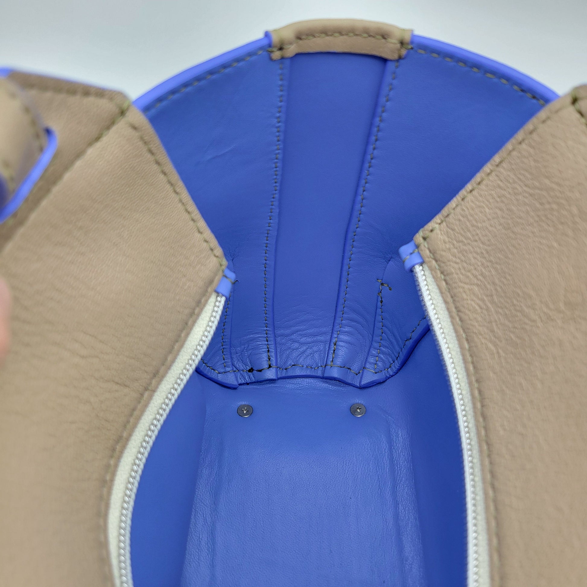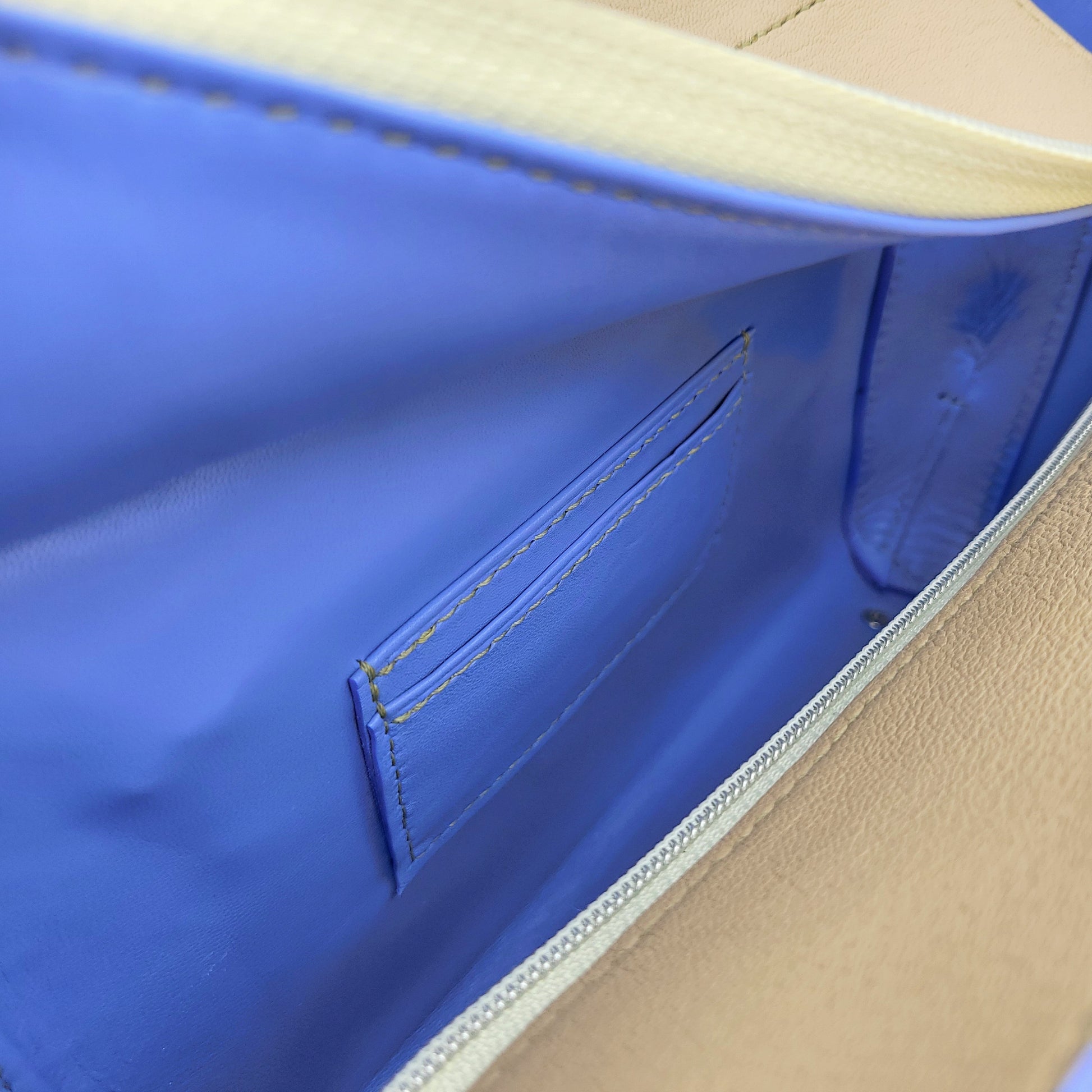 The Ellie is a functional and stylish leather handbag including the Marc Scott badge. This bag is made in Seattle, WA. We use artisan techniques such as hand stitching to ensure the bags are built to withstand a lifetime. This bag is a goat skin exterior that has a durable finish while still showing off the natural grain. The interior is a periwinkle soft goat skin. The top zipper opens up for full access to the interior of the bag which includes a button pocket and 2 card slot. The bag includes an exterior zipper pocket and four feet to help reduce the wear of the leather. L: 12" W: 4.5" H: 7"