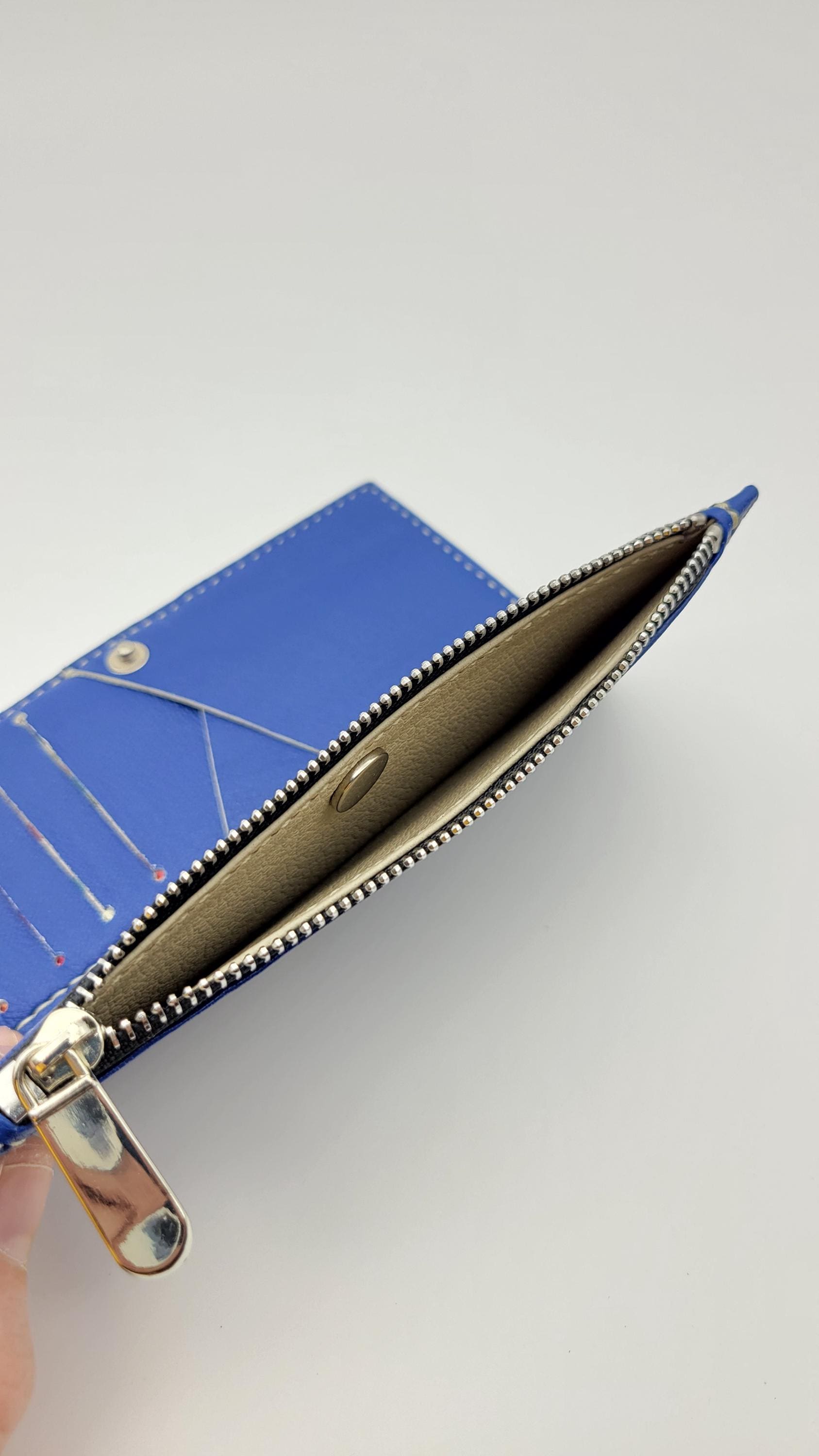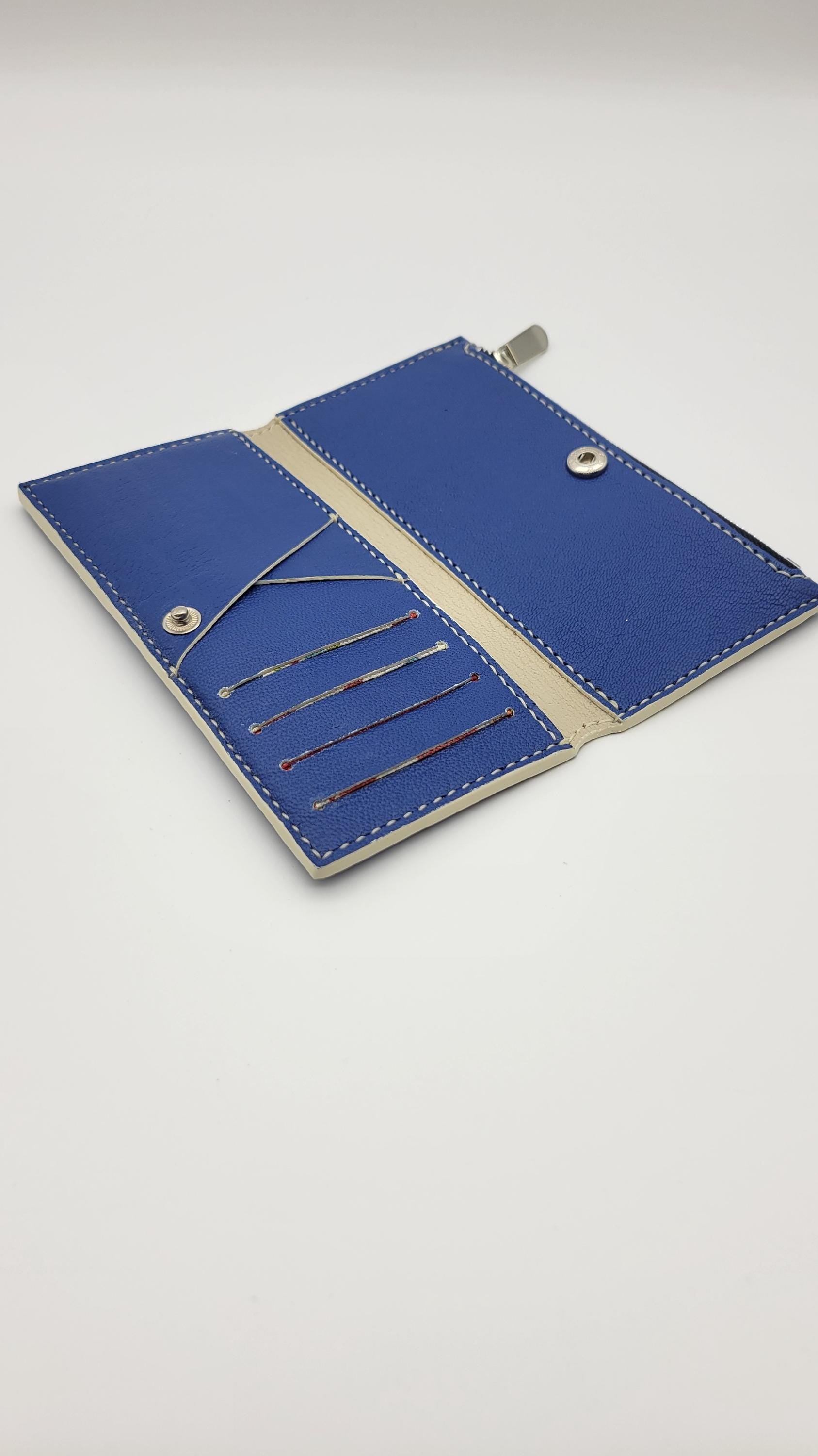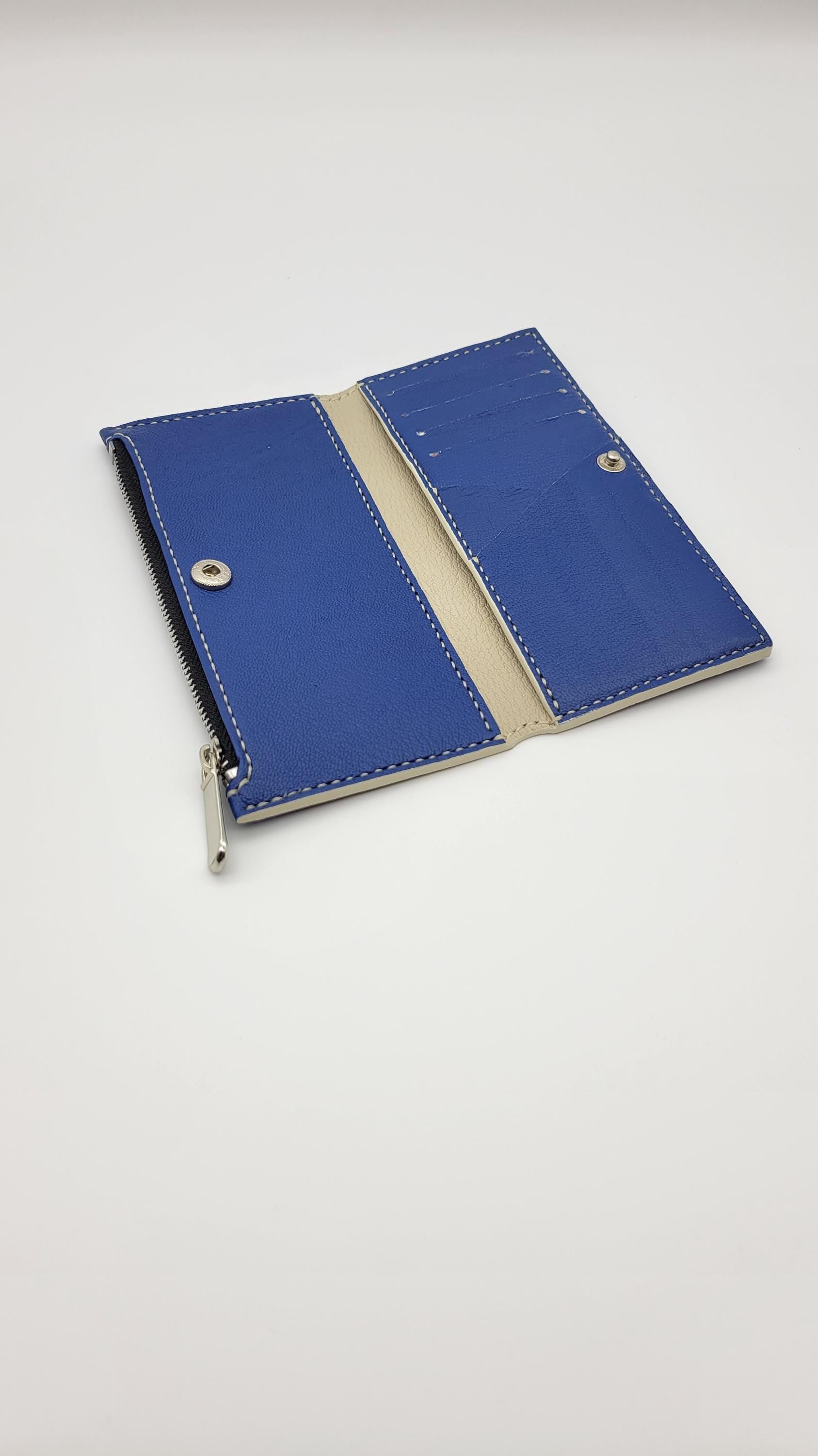 The Ivory is a folding wallet including a zip pocket, 5 card slot and a cash slot. It is lined leather. This piece has teal edge paint. It is 100% hand crafted. We cut, paint and sew all our products by hand. Hand painted logo.
