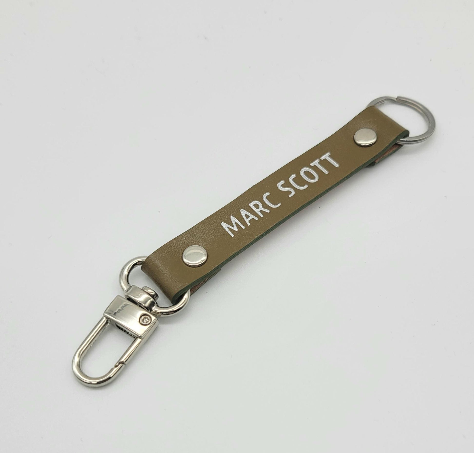 Our leather keychain is designed with functionality in mind. It features a sturdy metal ring that can accommodate multiple keys without compromising on strength or security. The blue leather strap is heat-stamped with the 'Marc Scott' logo, adding an exclusive touch to your everyday accessories.