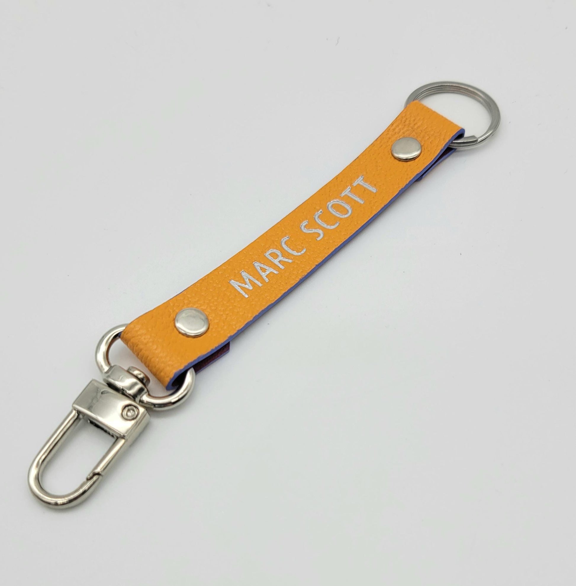 Our leather keychain is designed with functionality in mind. It features a sturdy metal ring that can accommodate multiple keys without compromising on strength or security. The blue leather strap is heat-stamped with the 'Marc Scott' logo, adding an exclusive touch to your everyday accessories.