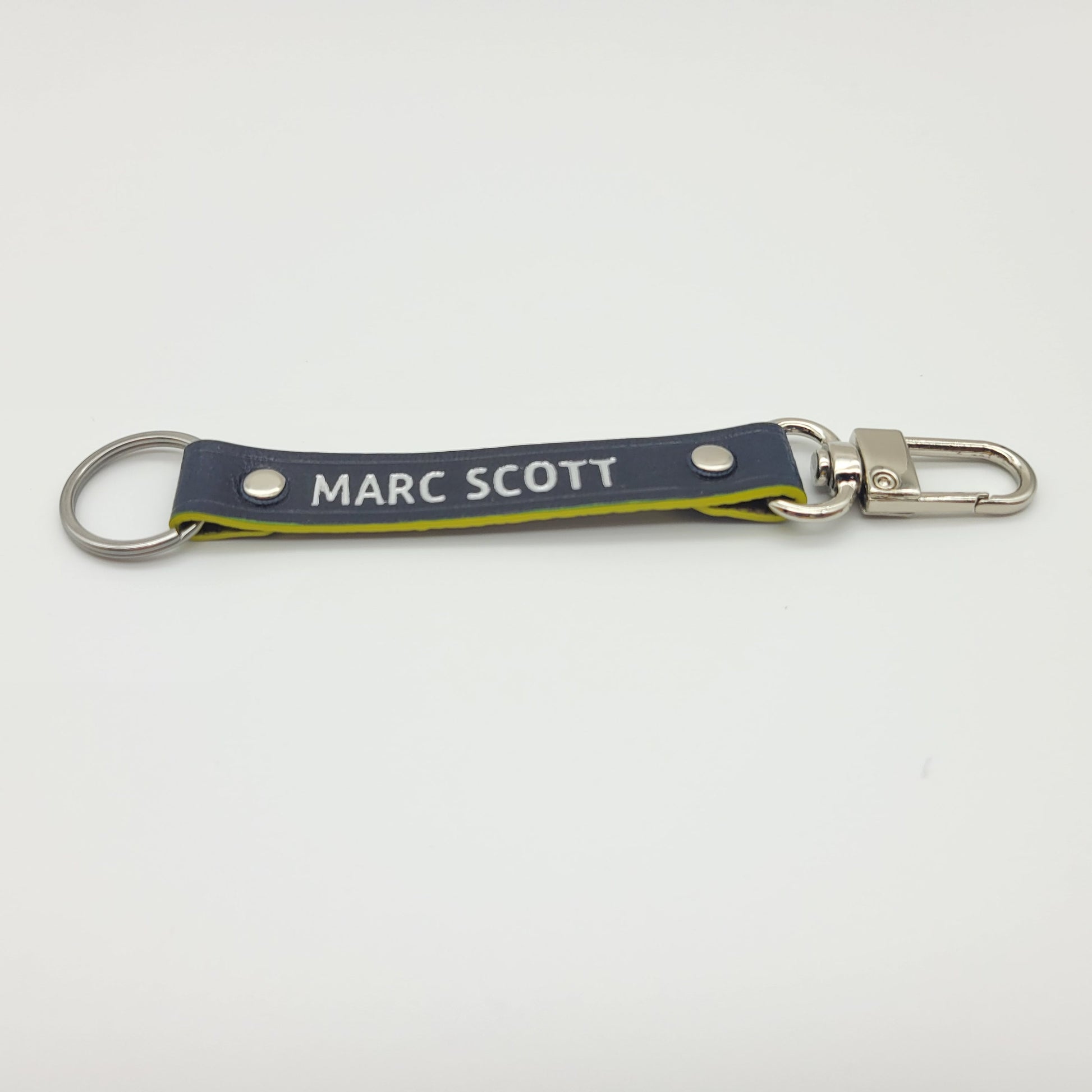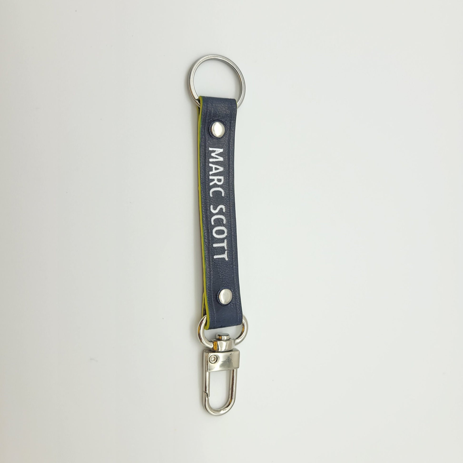 Our leather keychain is designed with functionality in mind. It features a sturdy metal ring that can accommodate multiple keys without compromising on strength or security. The blue leather strap is heat-stamped with the 'Marc Scott' logo, adding an exclusive touch to your everyday accessories.