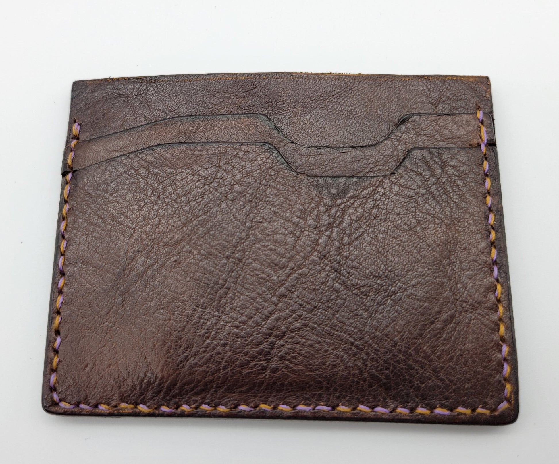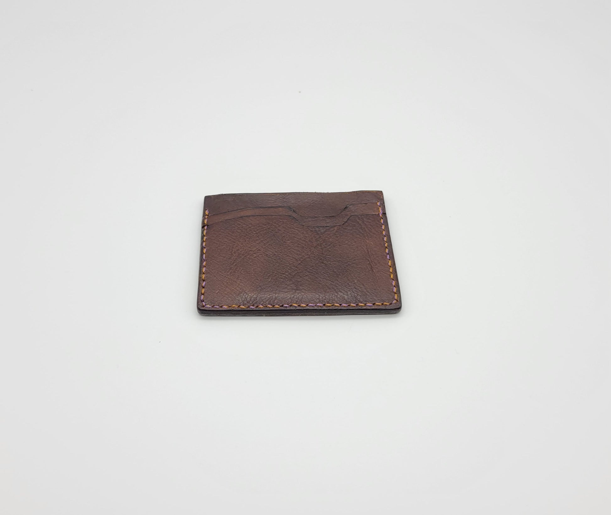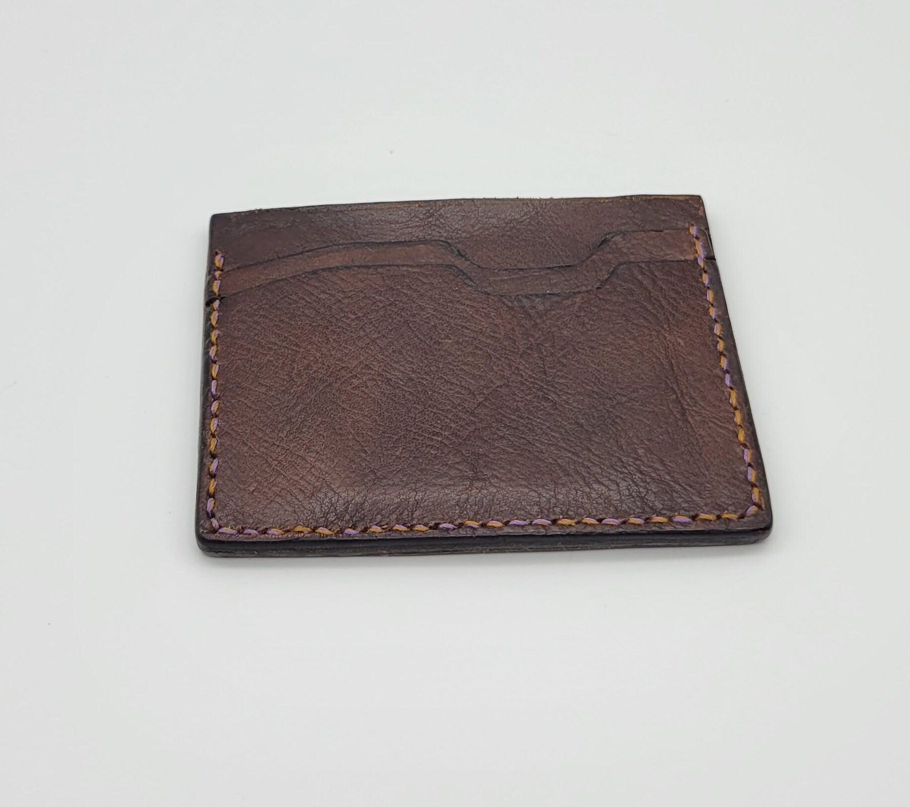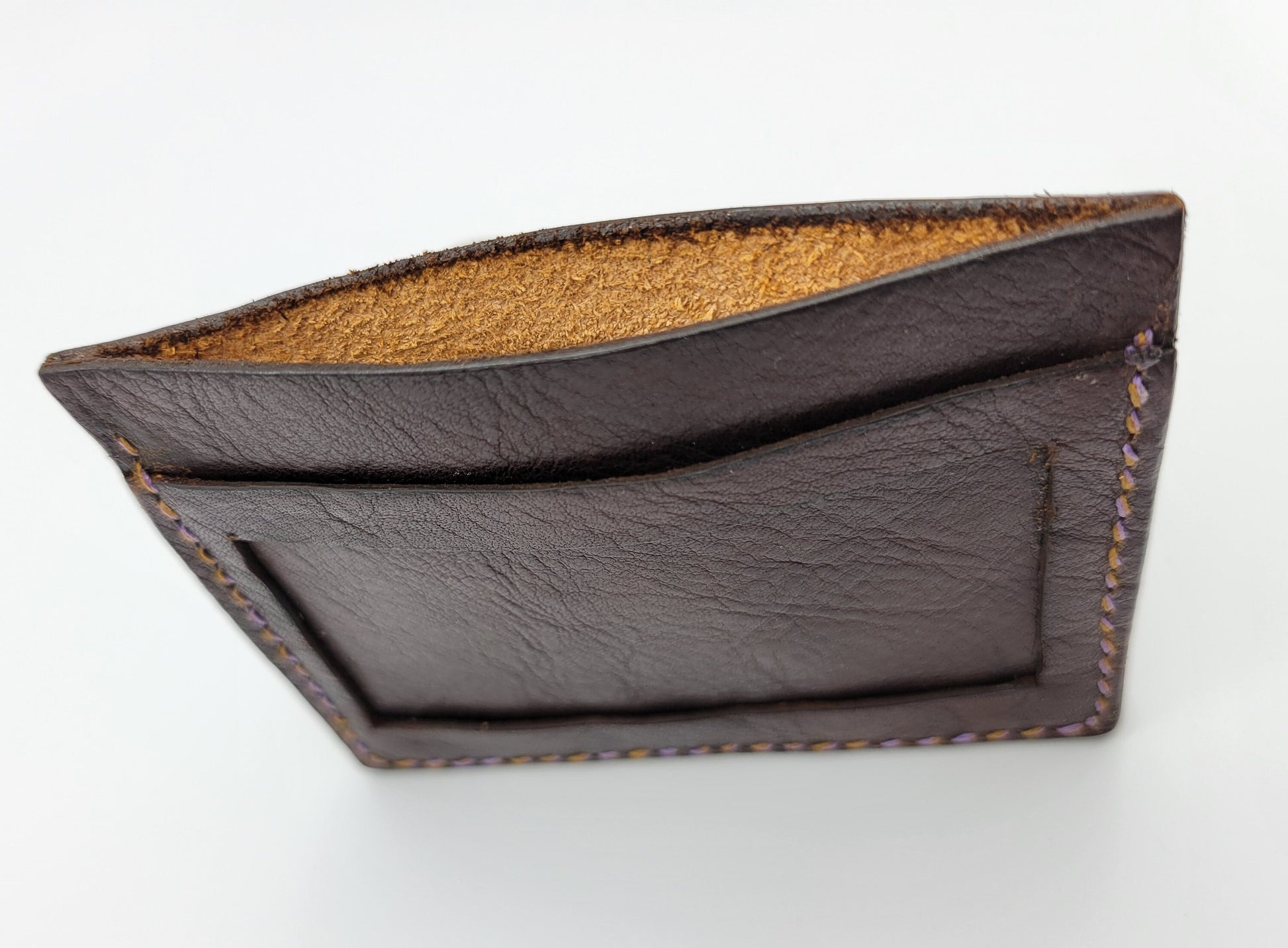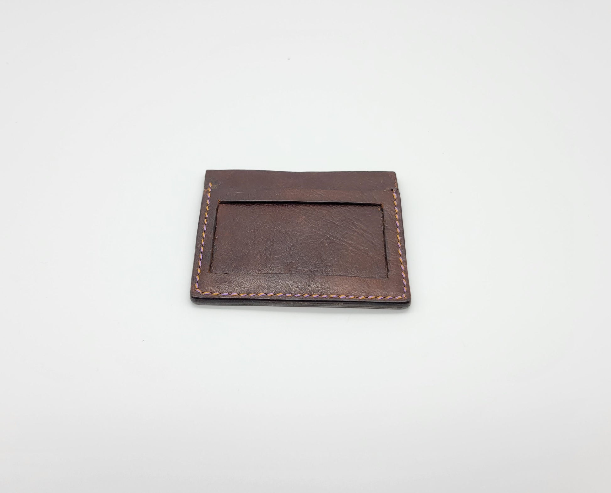 The Lex is a small, sleek top grain leather wallet. This dark brown leather wallet features a I.D. slot, middle slot and two card slots. This wallet has dyed edges. All our products are cut, sewn and finished by hand.