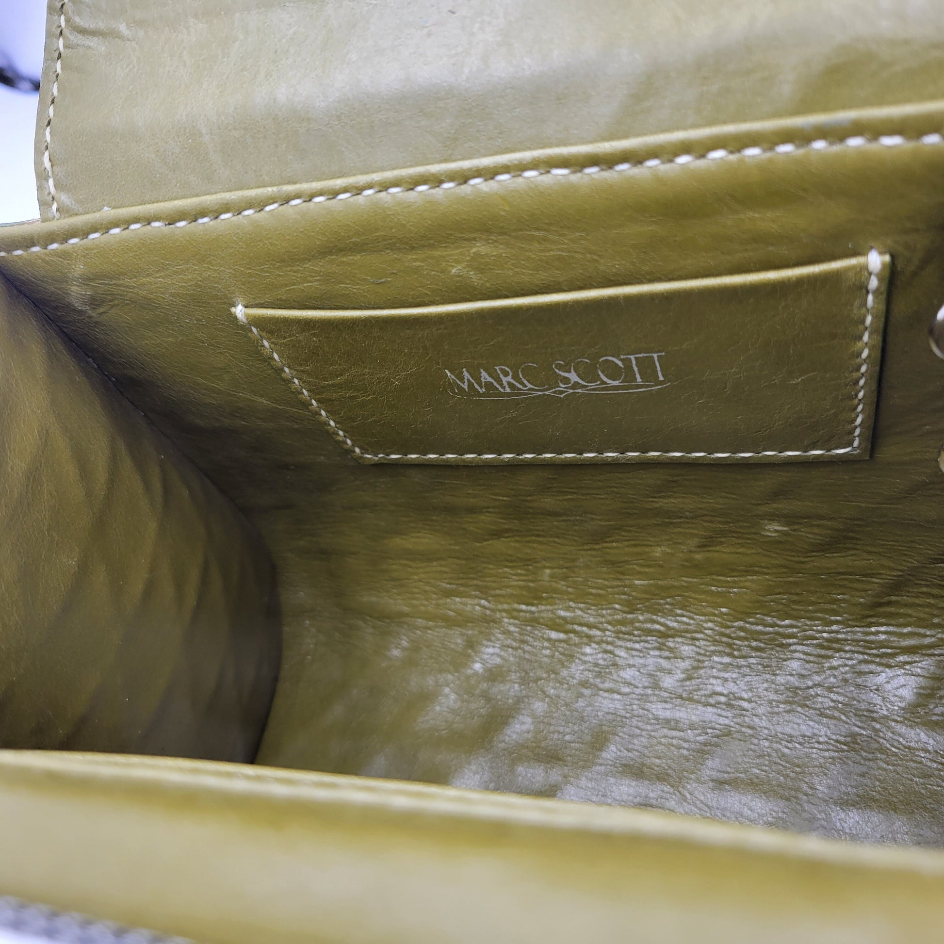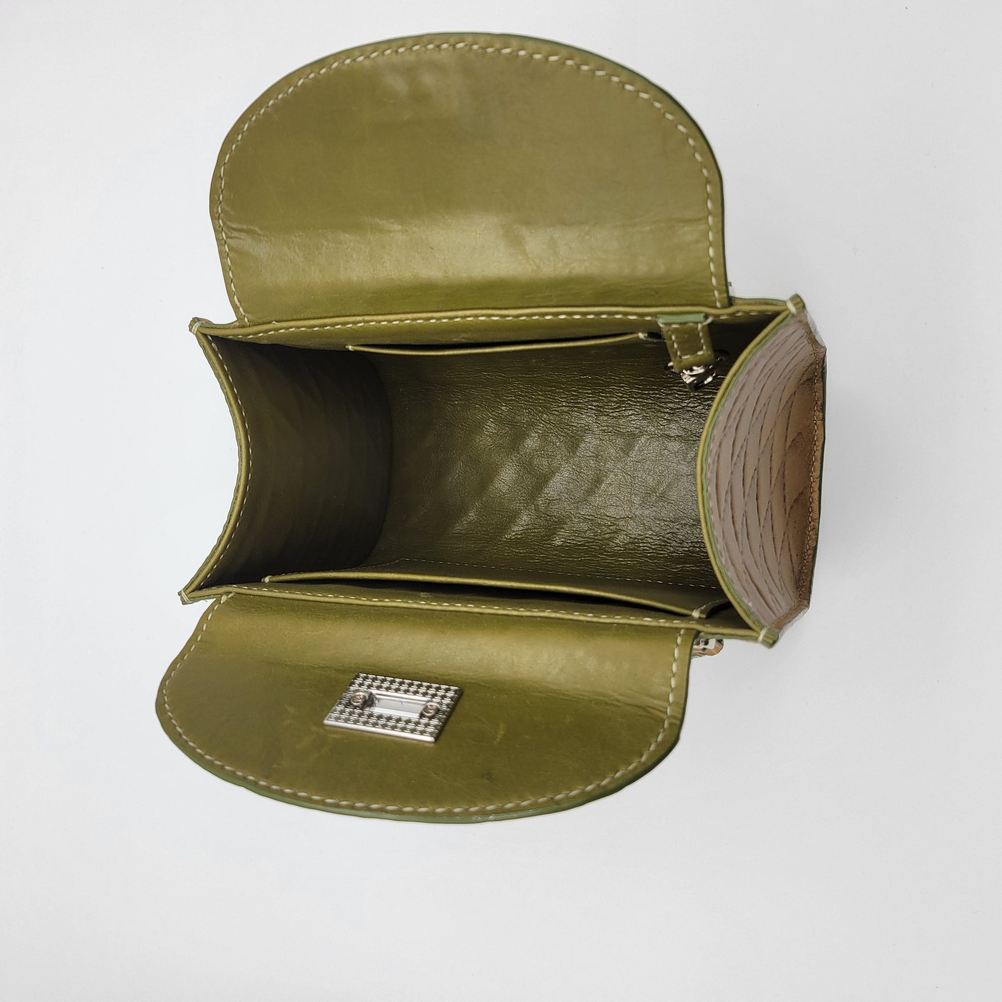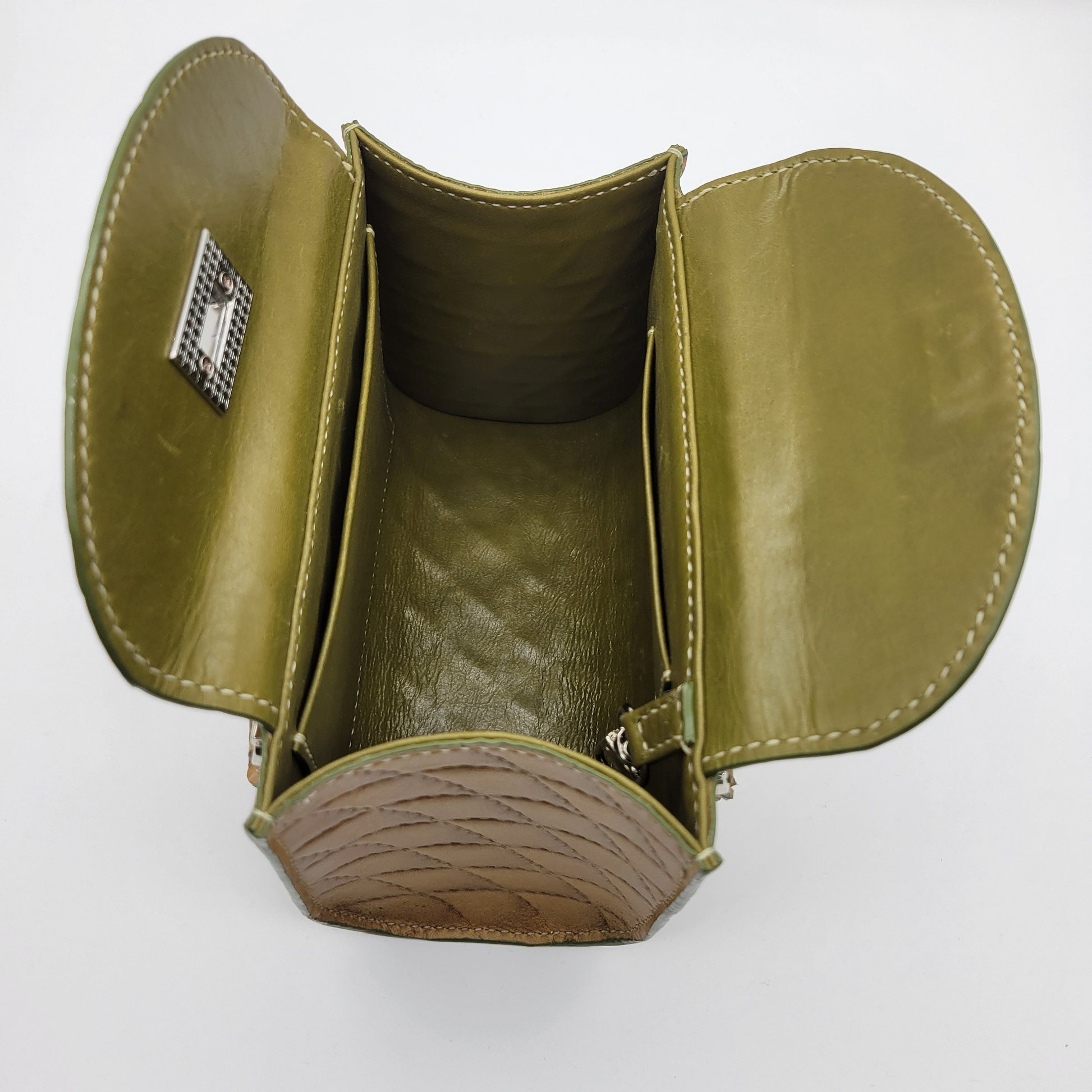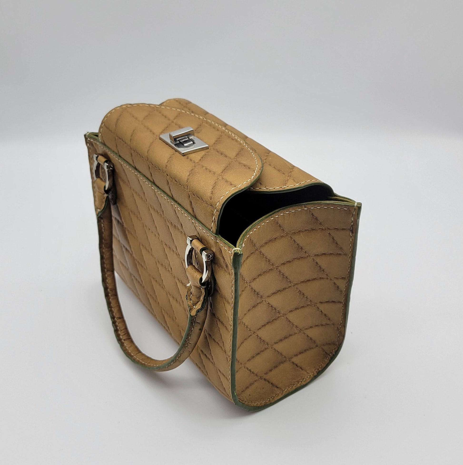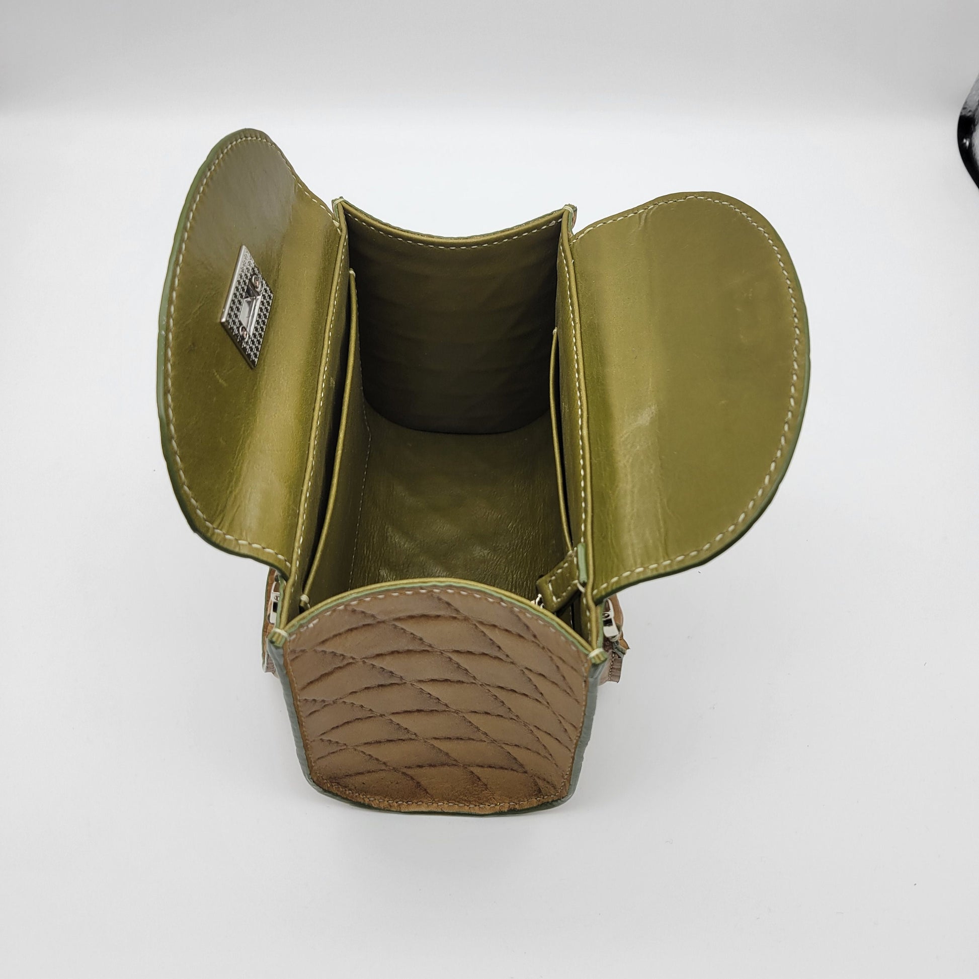 Mina is a to- handle bag with a top lock for great security. Inside futures a slip pocket and a card slot. This features a embossed cross stitch pattern on the brown leather. The interior is lined with a moss green leather.