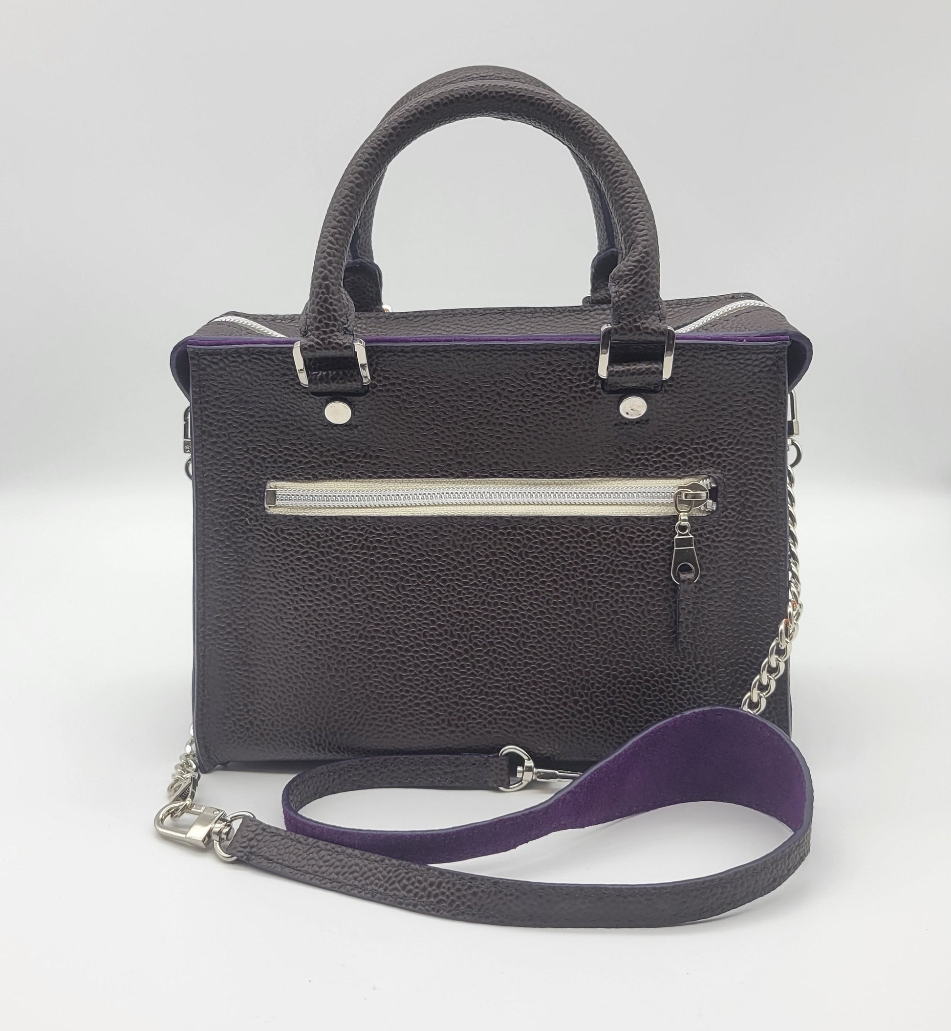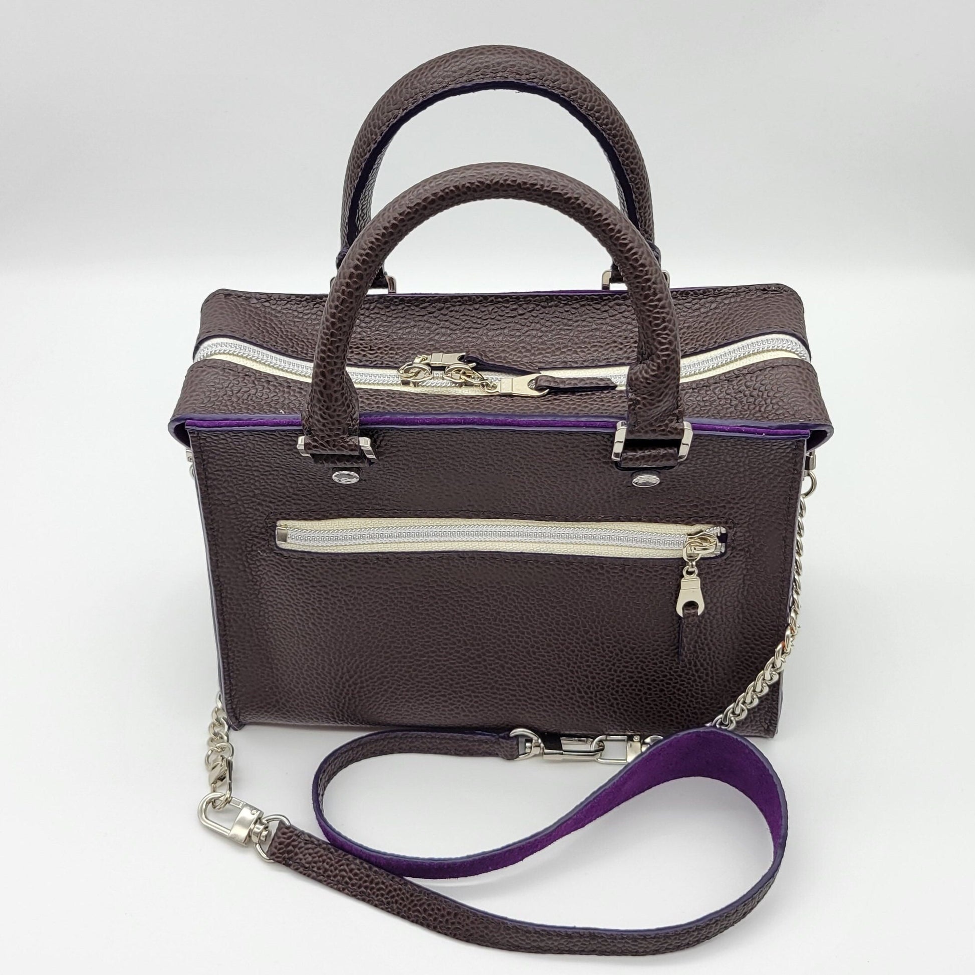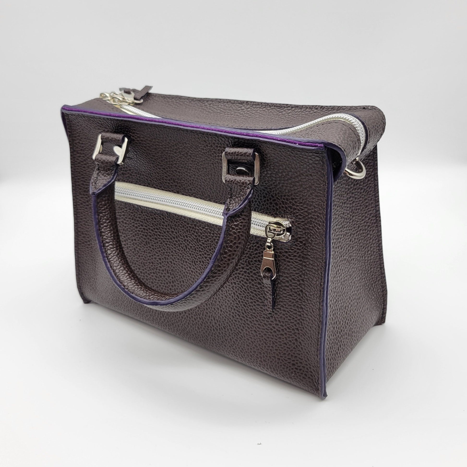 The Willo is a sand stitched top handle bag that is made with a pebbled dark brown leather including a pop of purple edge paint. It is lined with a purple suede leather including a zipper pocket and a flat pocket. This bag includes a zipper top for great security!
