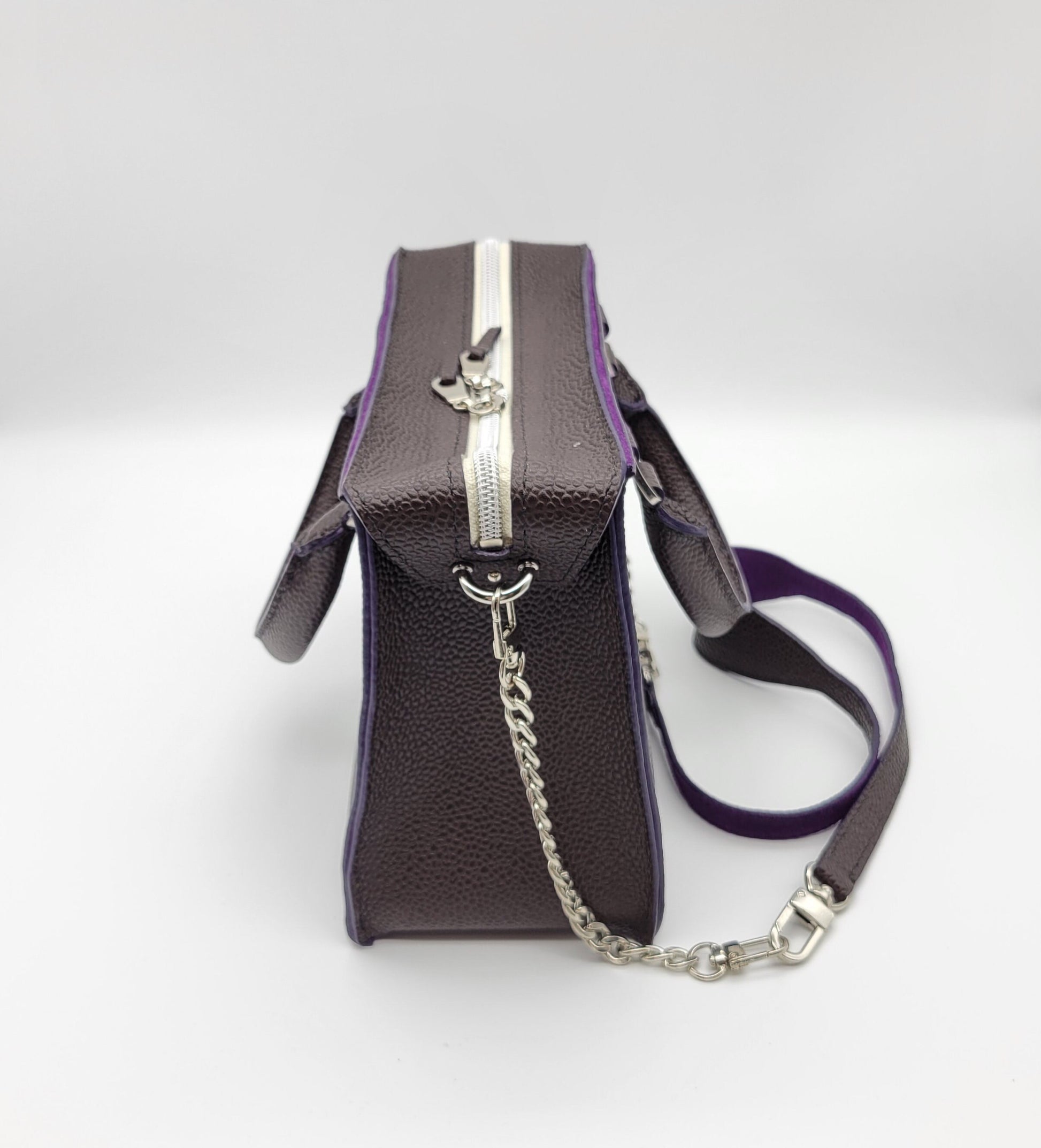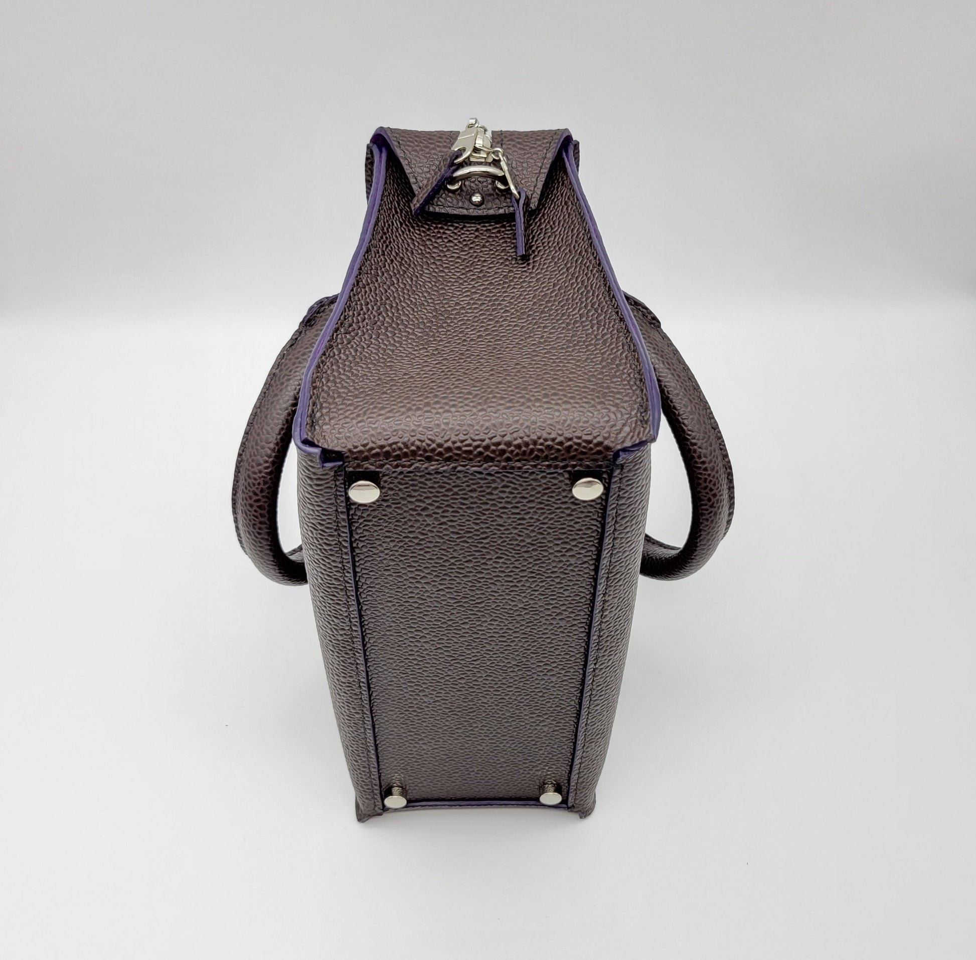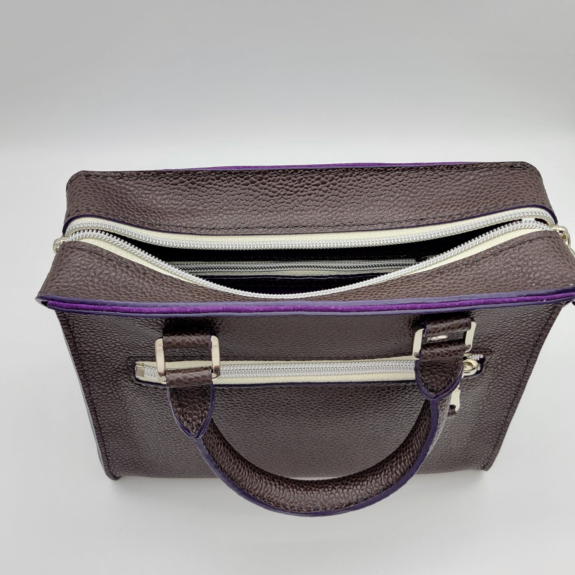 The Willo is a sand stitched top handle bag that is made with a pebbled dark brown leather including a pop of purple edge paint. It is lined with a purple suede leather including a zipper pocket and a flat pocket. This bag includes a zipper top for great security!