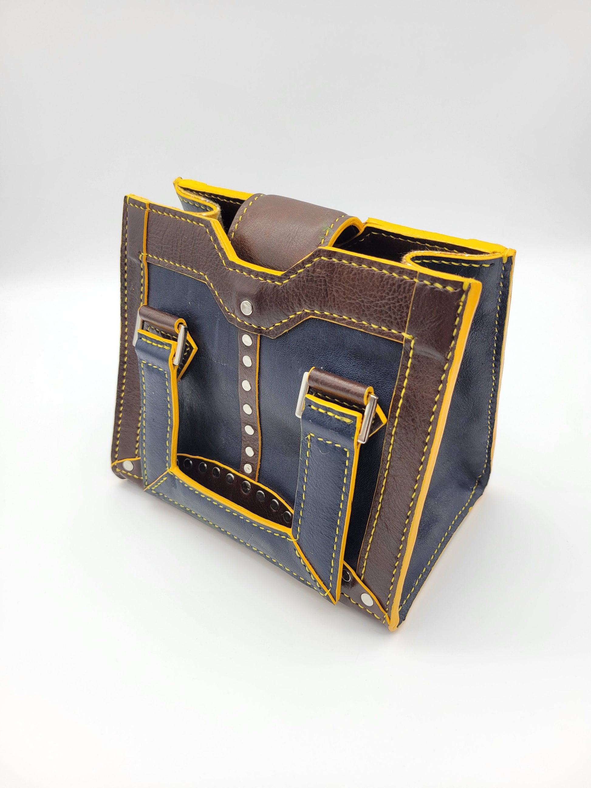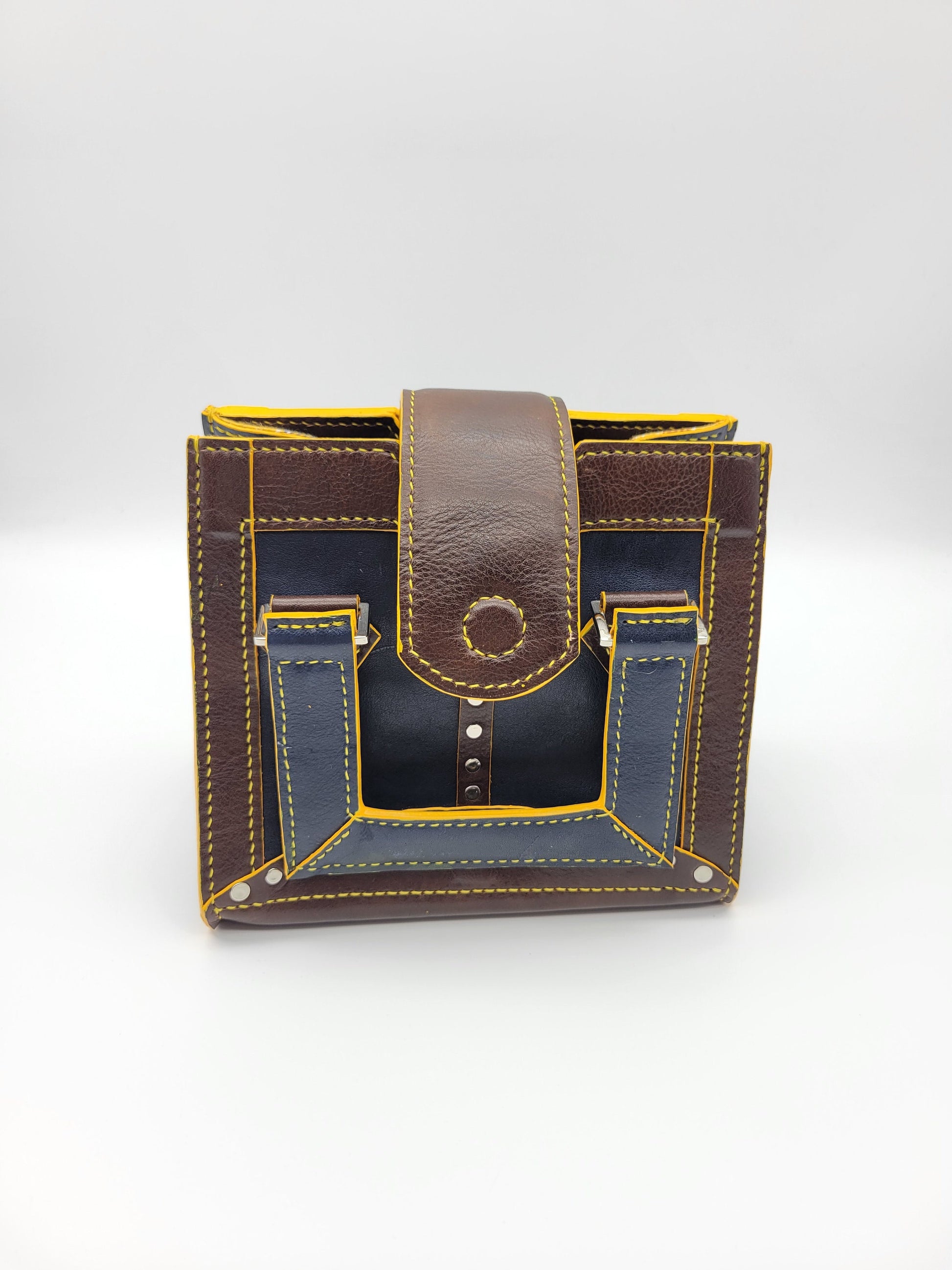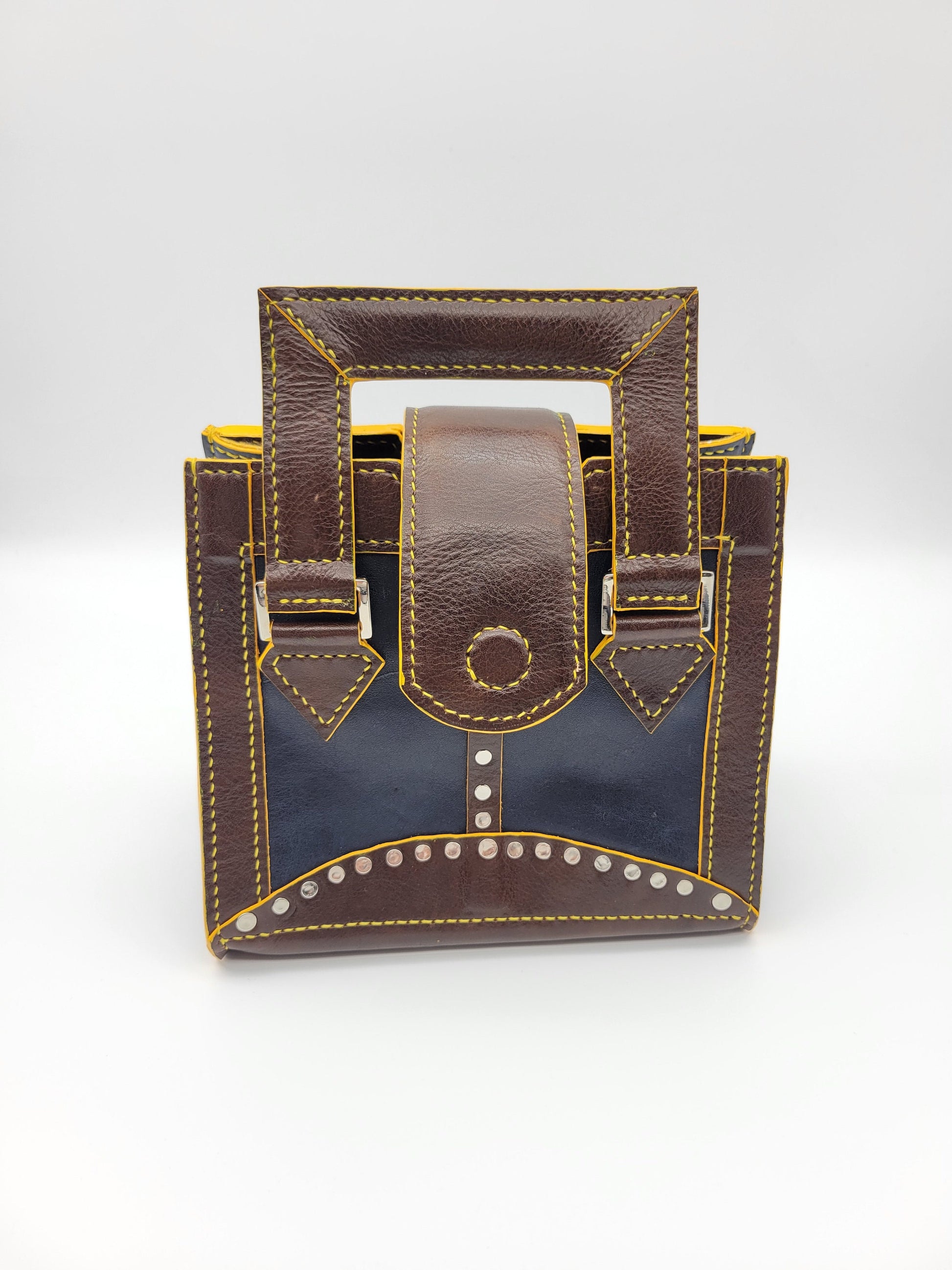 The Lilian is an artisans piece of work. The leather is a high quality blue and brown leather that is hand choosen. The interior is lines with colorful pattern on heavy cotton. This has a open pocket on the inside and a zipper pocket on the other inside wall. This bag includes a top handle that folds down and are opposite color depending on the side of the handle. This hand made bag is created with high quality leather that are sources one piece at a time. With this bag being hand stitched, it will withstand the test of time. Our focus on craftsmanship shines with theLilian. All our products are 100% handmade. We cut, sew and paint by hand.