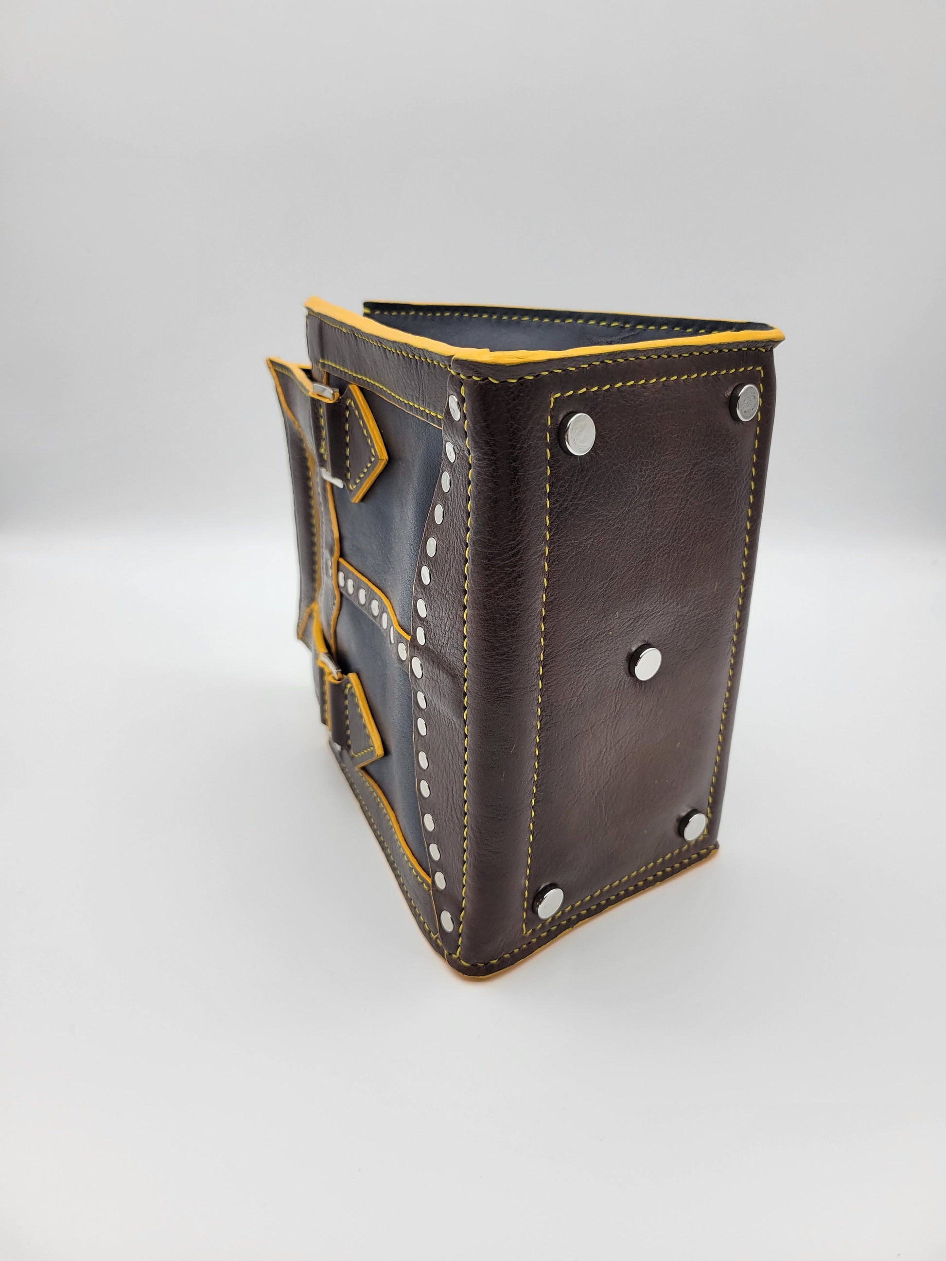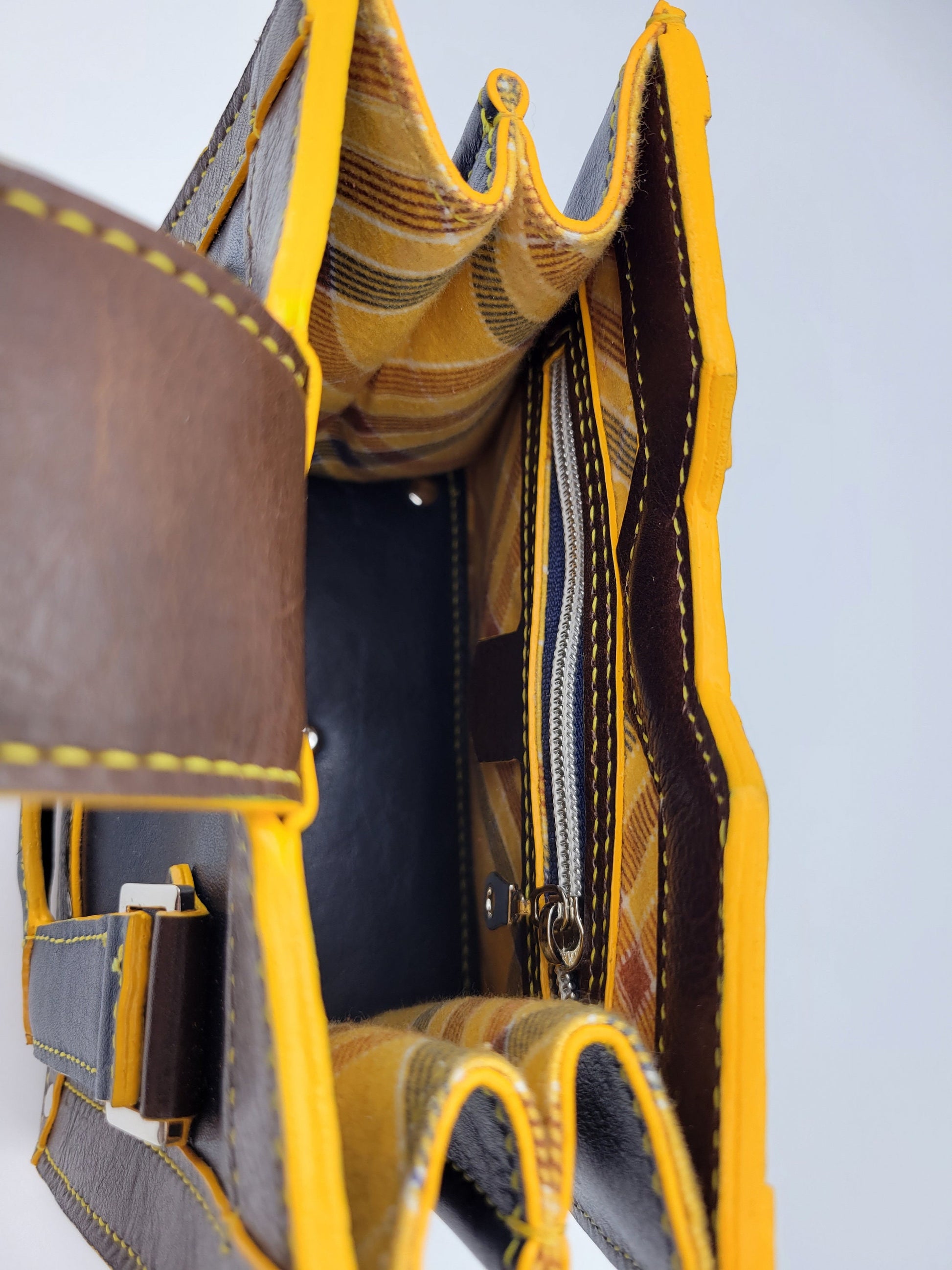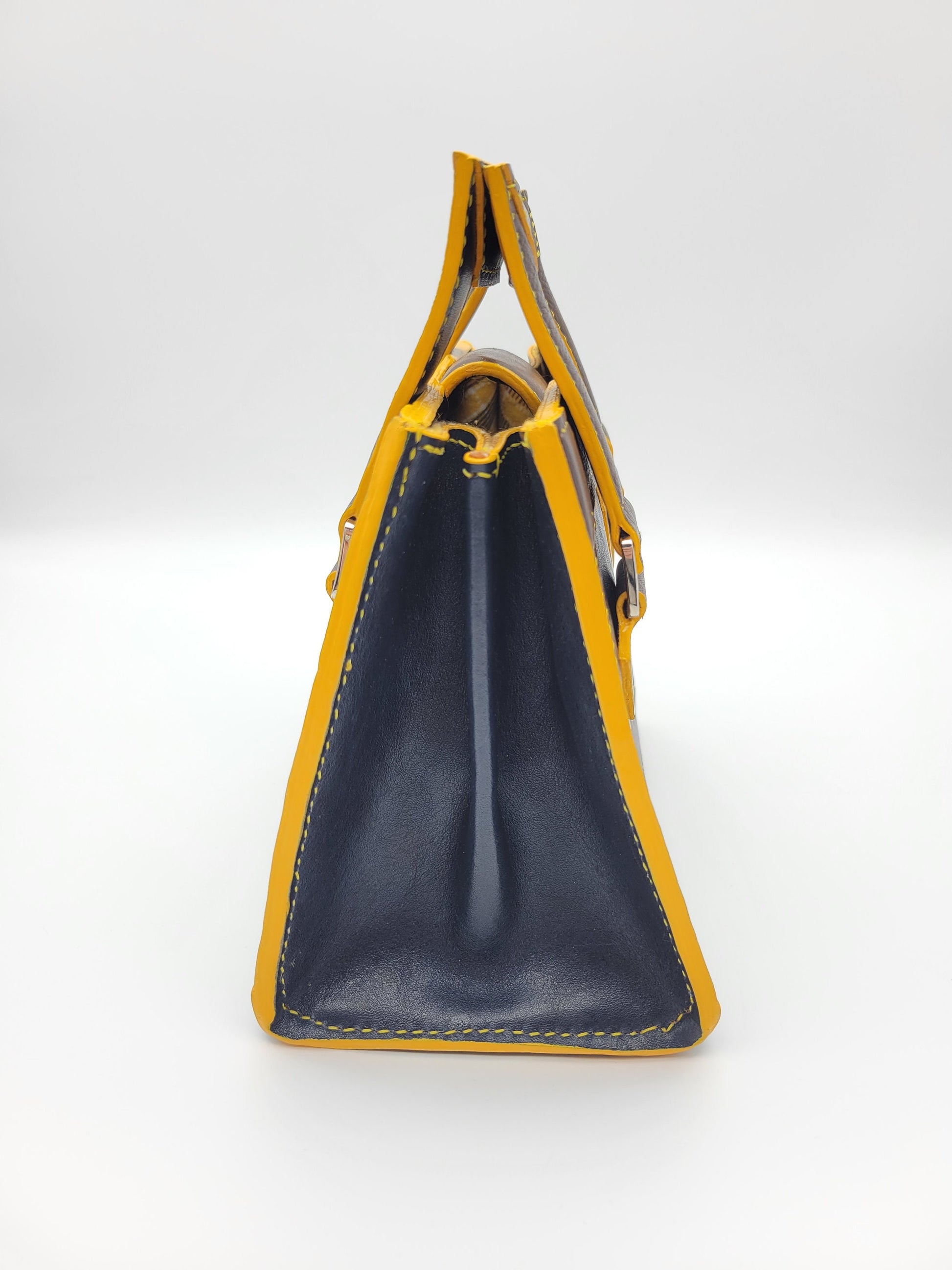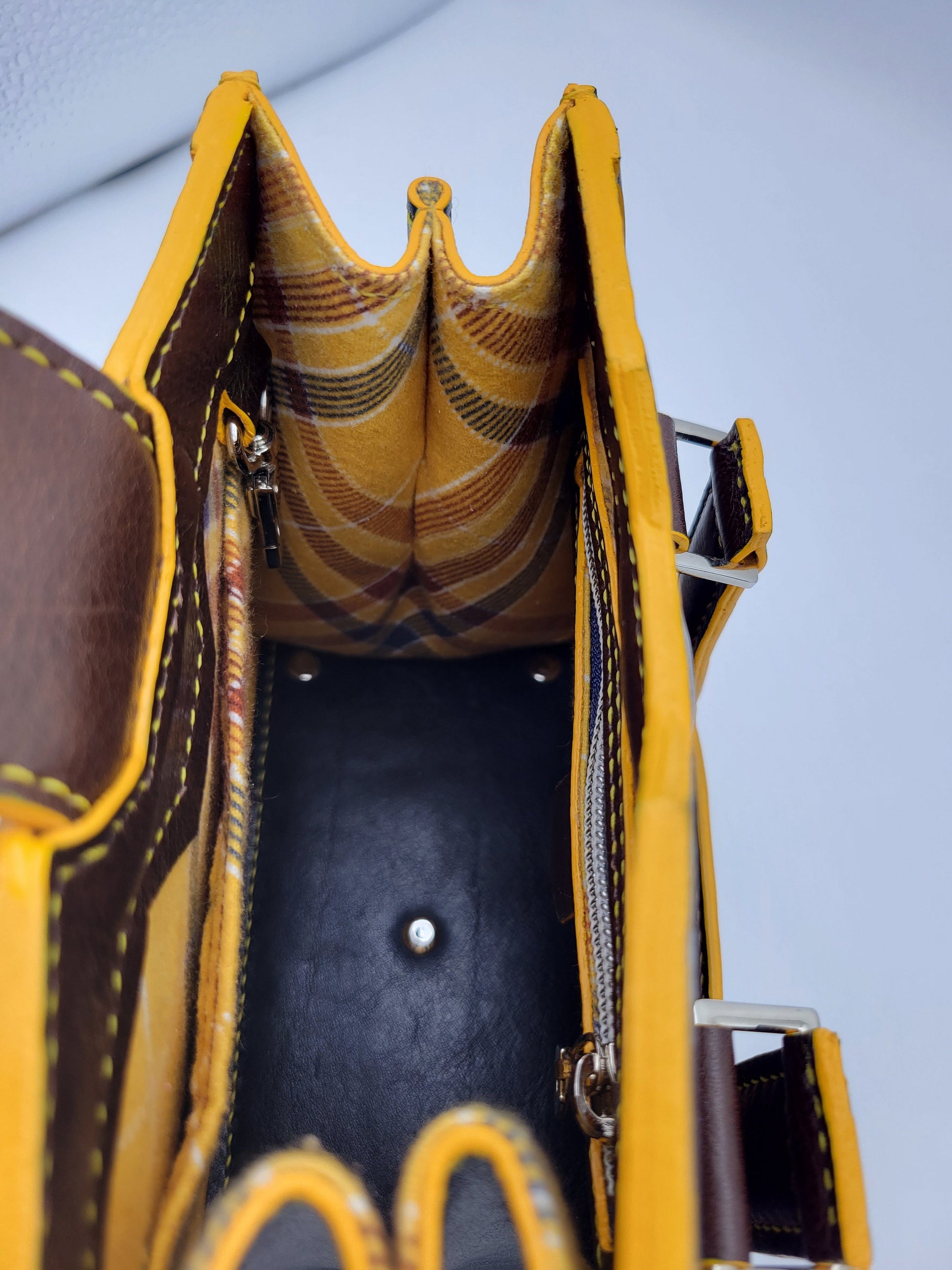 The Lilian is an artisans piece of work. The leather is a high quality blue and brown leather that is hand choosen. The interior is lines with colorful pattern on heavy cotton. This has a open pocket on the inside and a zipper pocket on the other inside wall. This bag includes a top handle that folds down and are opposite color depending on the side of the handle. This hand made bag is created with high quality leather that are sources one piece at a time. With this bag being hand stitched, it will withstand the test of time. Our focus on craftsmanship shines with theLilian. All our products are 100% handmade. We cut, sew and paint by hand.