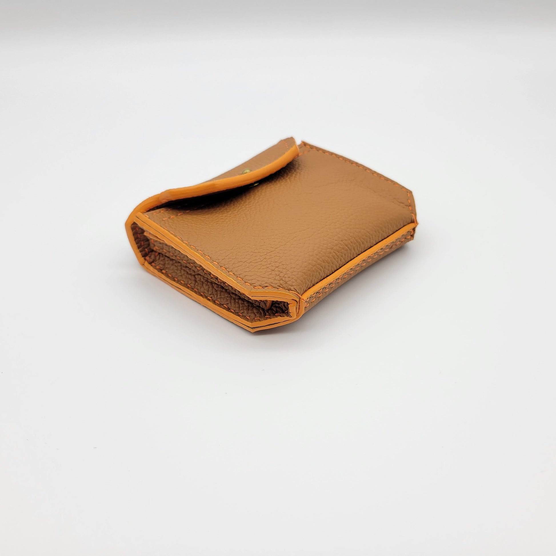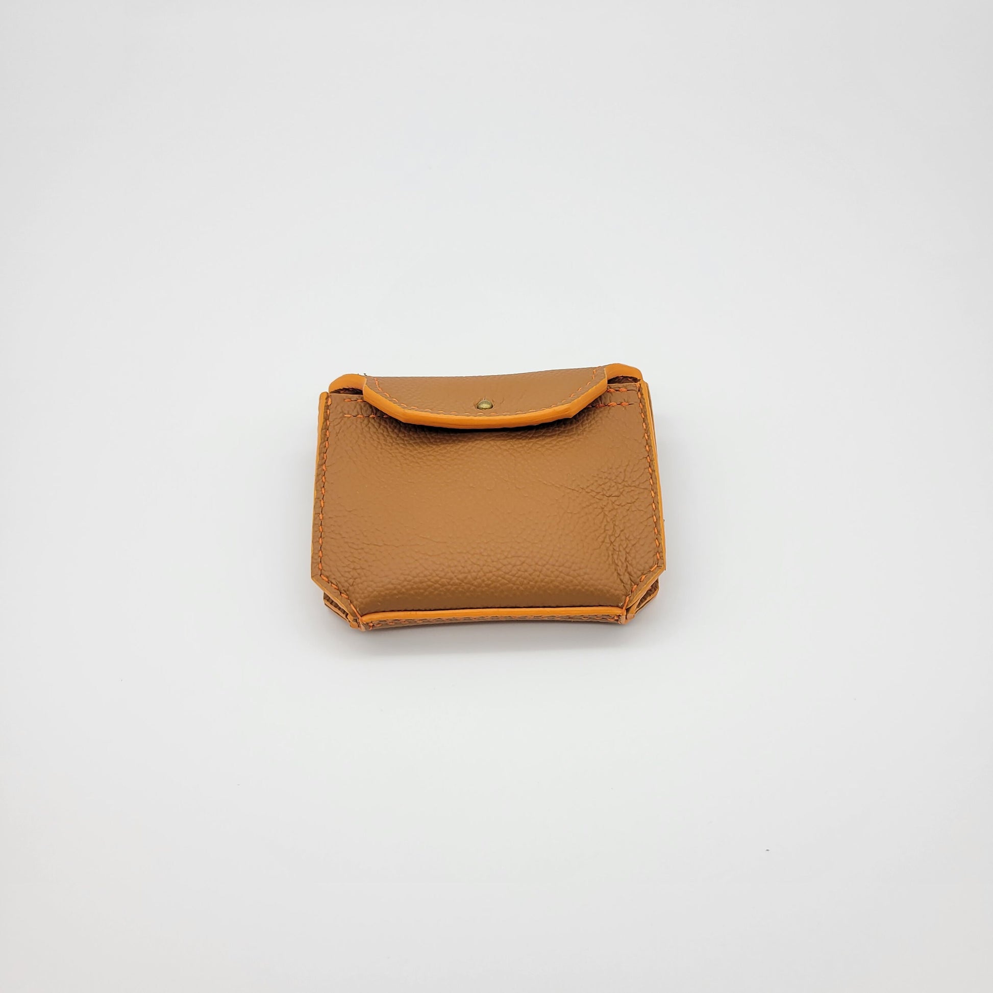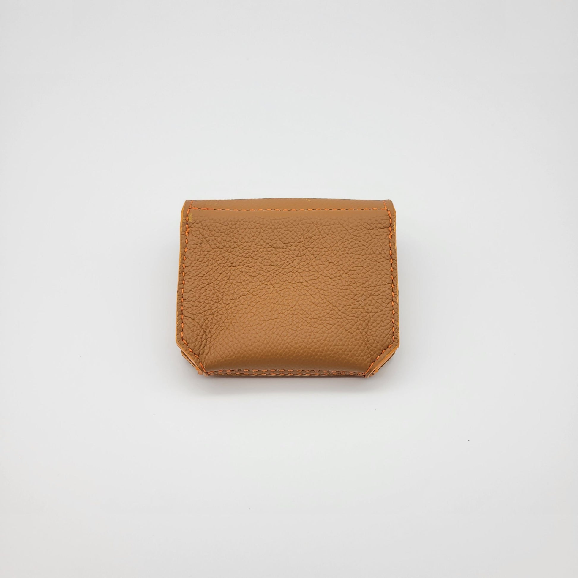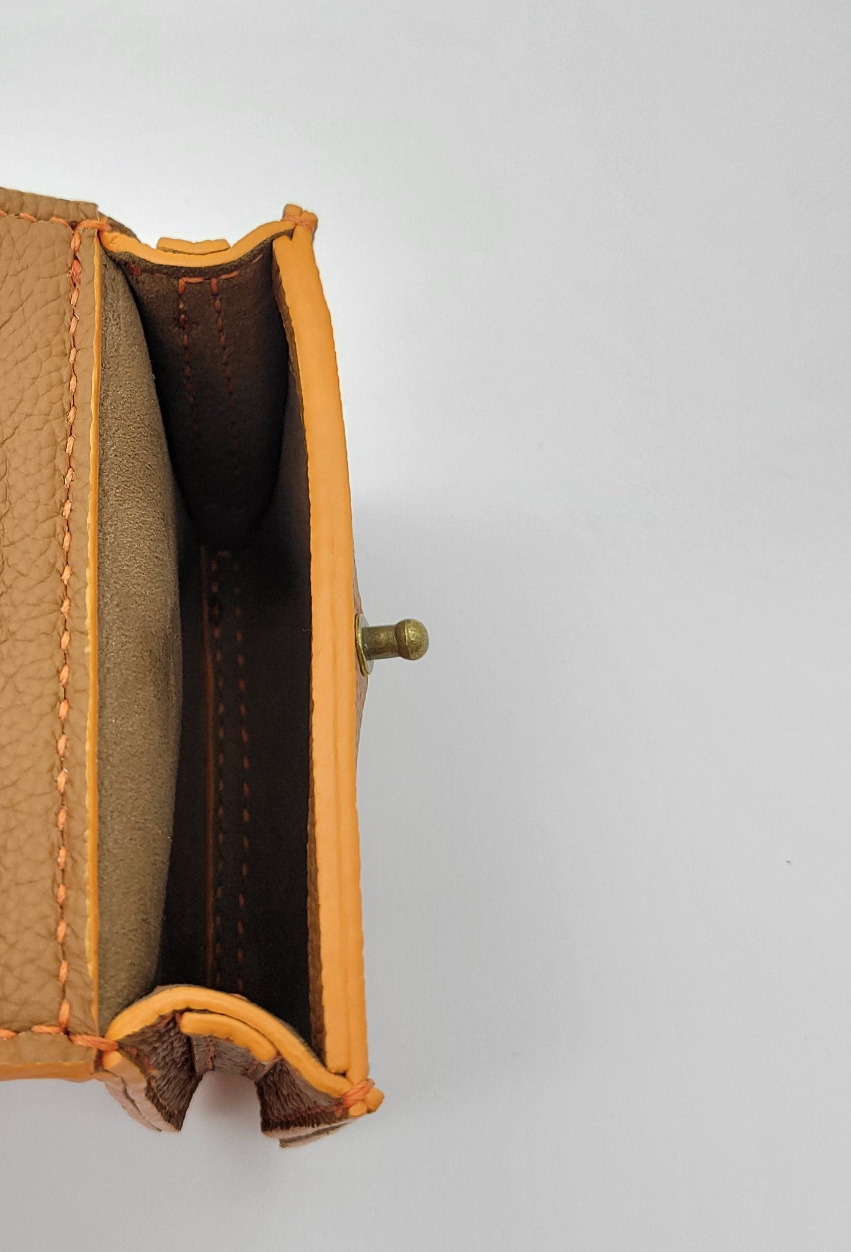 The Sloan SLG is a card pouch that can hold an ample amount of cards, cash or even headphones. This bag is made with a soft pebbled caramel outside leather with a light brown suede lining. It includes orange painted edges with matching thread. This bag is crafted 100% by hand. We cut, sew and paint by hand.