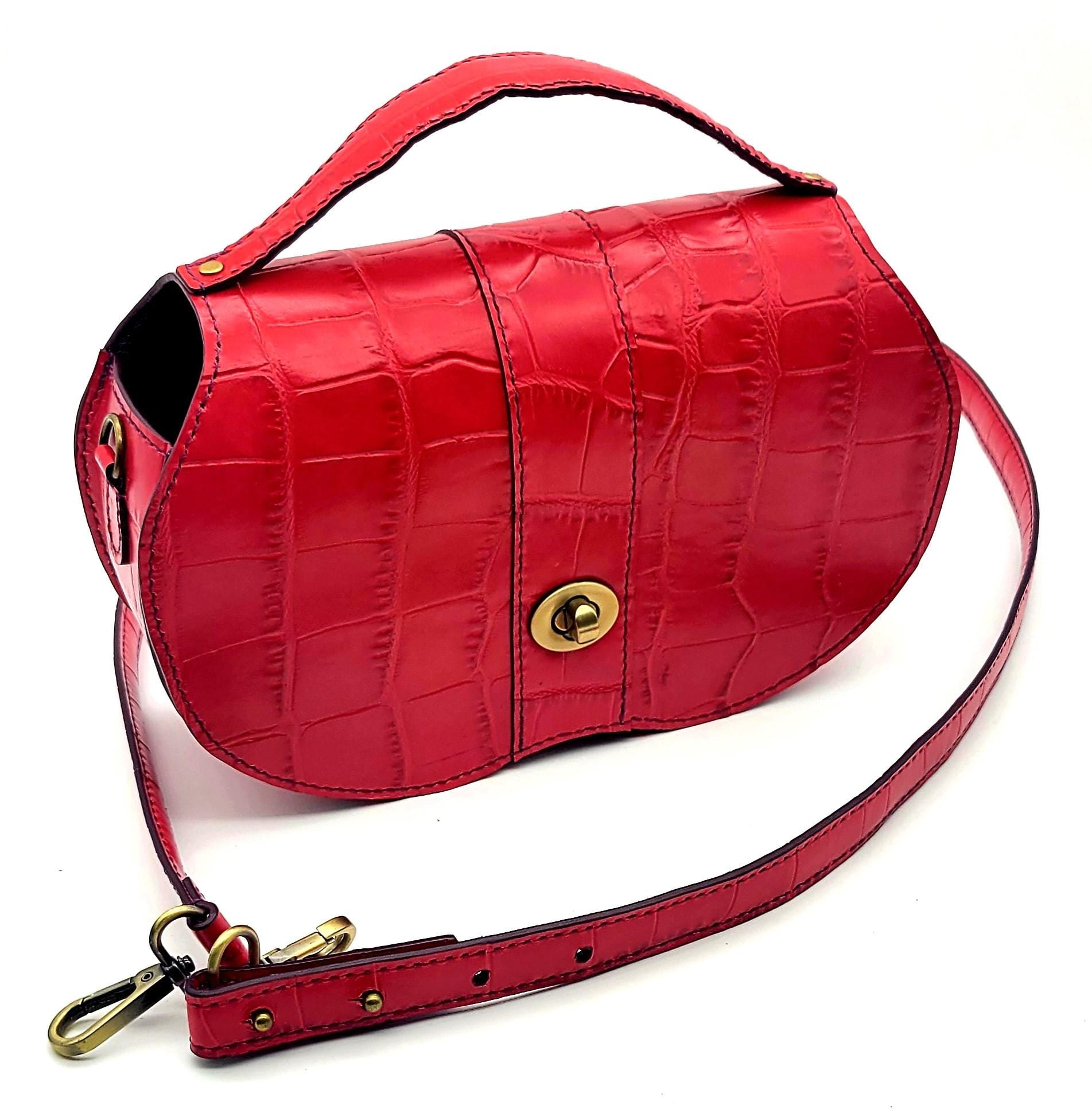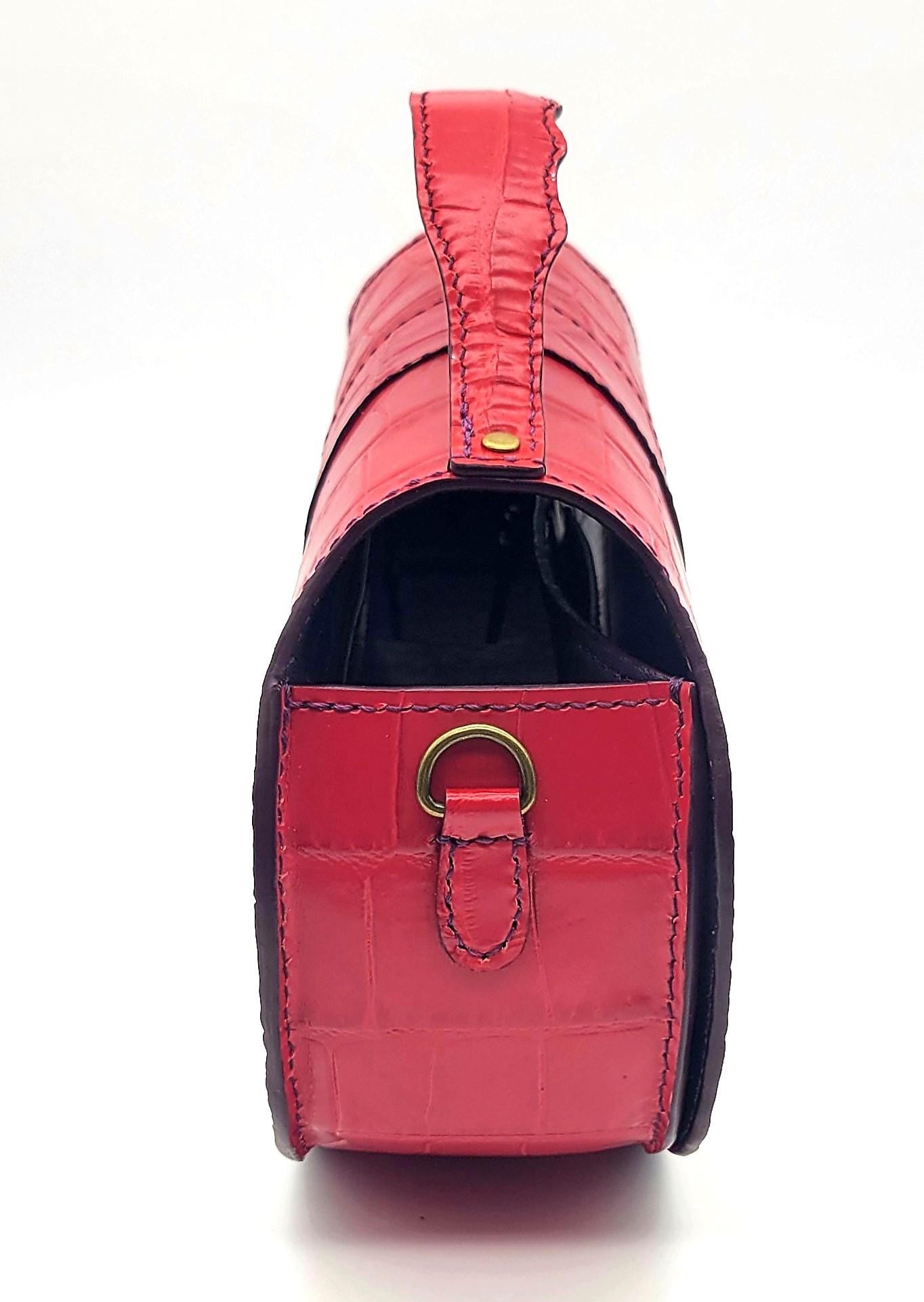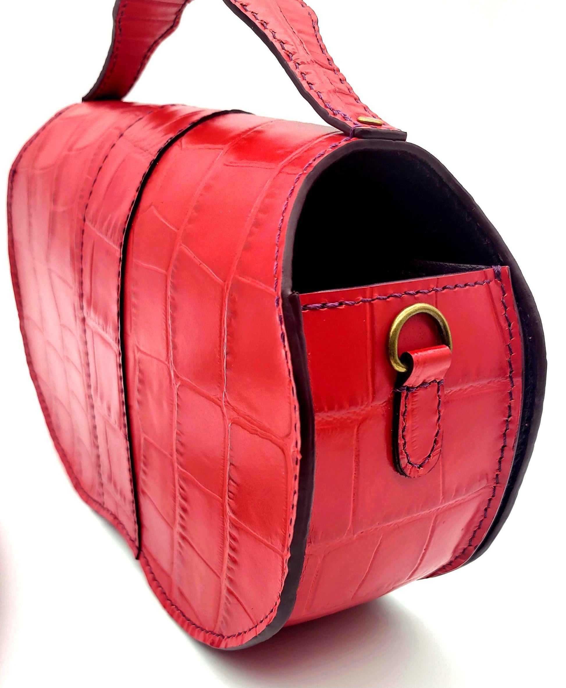 This version of the Zoe is a one-of-one hand stitched handbag. The red alligator embossed leather provides a sleek look allowing it to really POP! The top handle and adjustable cross body make this bag versatile. This bags artisan techniques leads to a bag that will last a lifetime! Including a turn lock for security, inside zip pocket and card pocket on the front wall. Featuring a large inside compartment!