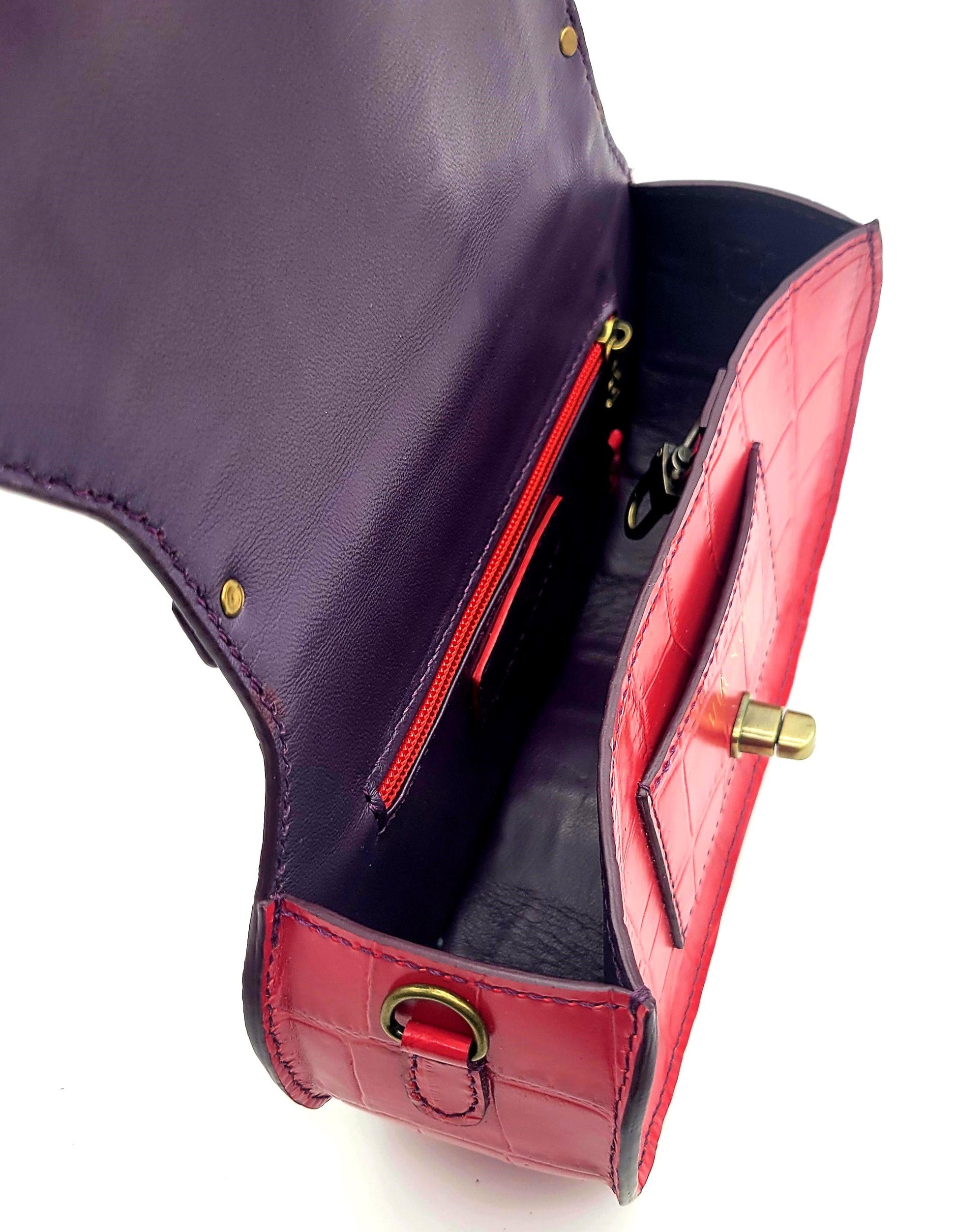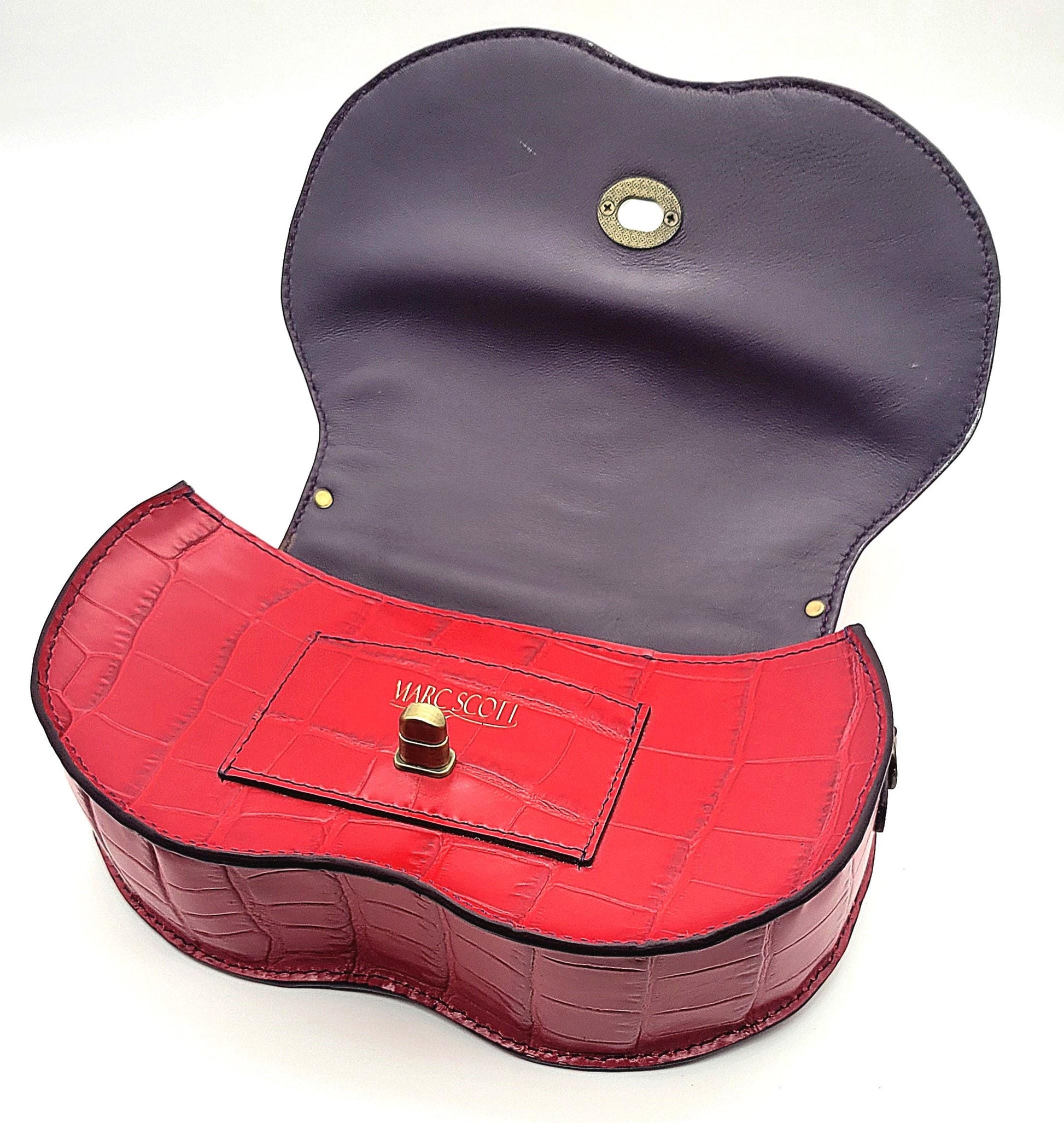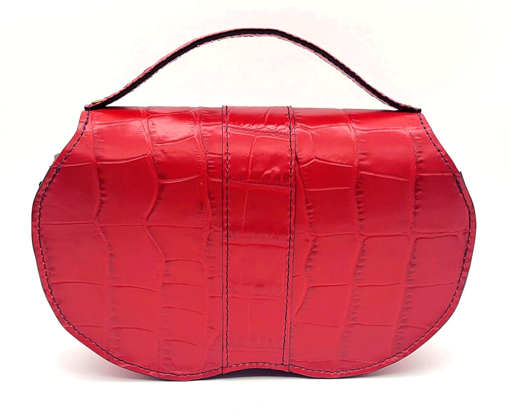 This version of the Zoe is a one-of-one hand stitched handbag. The red alligator embossed leather provides a sleek look allowing it to really POP! The top handle and adjustable cross body make this bag versatile. This bags artisan techniques leads to a bag that will last a lifetime! Including a turn lock for security, inside zip pocket and card pocket on the front wall. Featuring a large inside compartment!